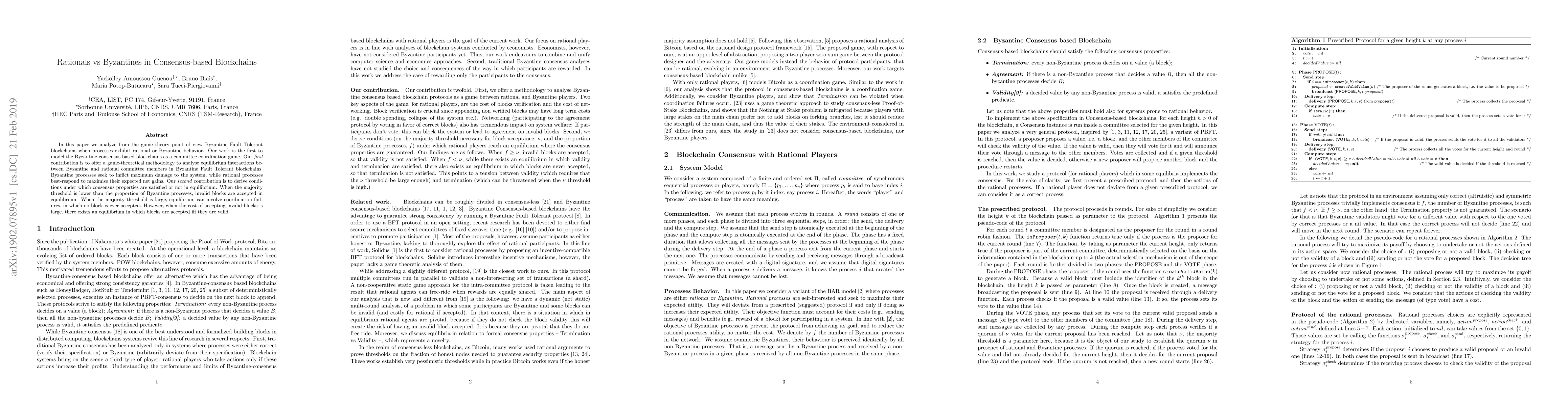 In this paper we analyze from the game theory point of view Byzantine Fault Tolerant blockchains when processes exhibit rational or Byzantine behavior. Our work is the first to model the Byzantine-consensus based blockchains as a committee coordination game. Our first contribution is to offer a game-theoretical methodology to analyse equilibrium interactions between Byzantine and rational committee members in Byzantine Fault Tolerant blockchains. Byzantine processes seek to inflict maximum damage to the system, while rational processes best-respond to maximise their expected net gains. Our second contribution is to derive conditions under which consensus properties are satisfied or not in equilibrium. When the majority threshold is lower than the proportion of Byzantine processes, invalid blocks are accepted in equilibrium. When the majority threshold is large, equilibrium can involve coordination failures , in which no block is ever accepted. However, when the cost of accepting invalid blocks is large, there exists an equilibrium in which blocks are accepted iff they are valid.