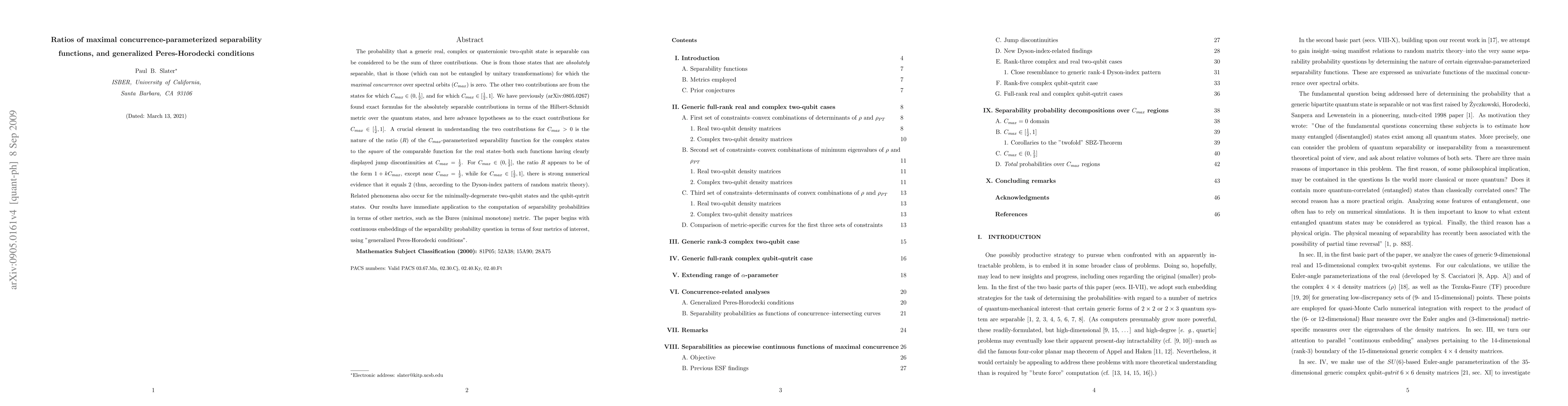 The probability that a generic real, complex or quaternionic two-qubit state is separable can be considered to be the sum of three contributions. One is from those states that are absolutely separable, that is those (which can not be entangled by unitary transformations) for which the maximal concurrence over spectral orbits (C_{max}) is zero. The other two contributions are from the states for which C_{max} in [0,1/2], and for which C_{max} in [1/2,1]. We have previously (arXiv:0805.0267) found exact formulas for the absolutely separable contributions in terms of the Hilbert-Schmidt metric over the quantum states, and here advance hypotheses as to the exact contributions for C_{max} in [1/2,1]. A crucial element in understanding the other two contributions is the nature of the ratio (R) of the C_{max}-parameterized separability function for the complex states to the square of the comparable function for the real states--both such functions having clearly displayed jump discontinuities at C_{max}=1/2. For C_{max} in [0,1/2], R appears to be of the form 1+ k C_{max}, except near C_{max}=1/2, while for C_{max} in [1/2,1], it seems to be a constant (thus according to the Dyson-index pattern of random matrix theory). Related phenomena also occur for the minimally-degenerate two-qubit states and the qubit-qutrit states. Our results have immediate application to the computation of separability probabilities in terms of other metrics, such as the Bures (minimal monotone) metric. The paper begins with continuous embeddings of the separability probability question in terms of four metrics of interest, using "generalized Peres-Horodecki conditions".