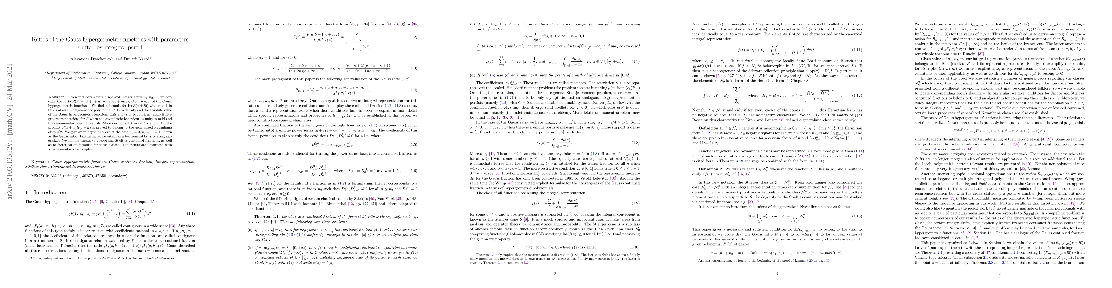 This paper derives a formula for the jump of the ratio of two shifted Gauss hypergeometric functions over a branch cut, using real hypergeometric polynomials and the beta density. It constructs integral representations for these ratios under mild asymptotic conditions and explores their membership in generalized Nevanlinna classes, with detailed analysis of the Gauss ratio and connections to continued fractions and factorization formulae.