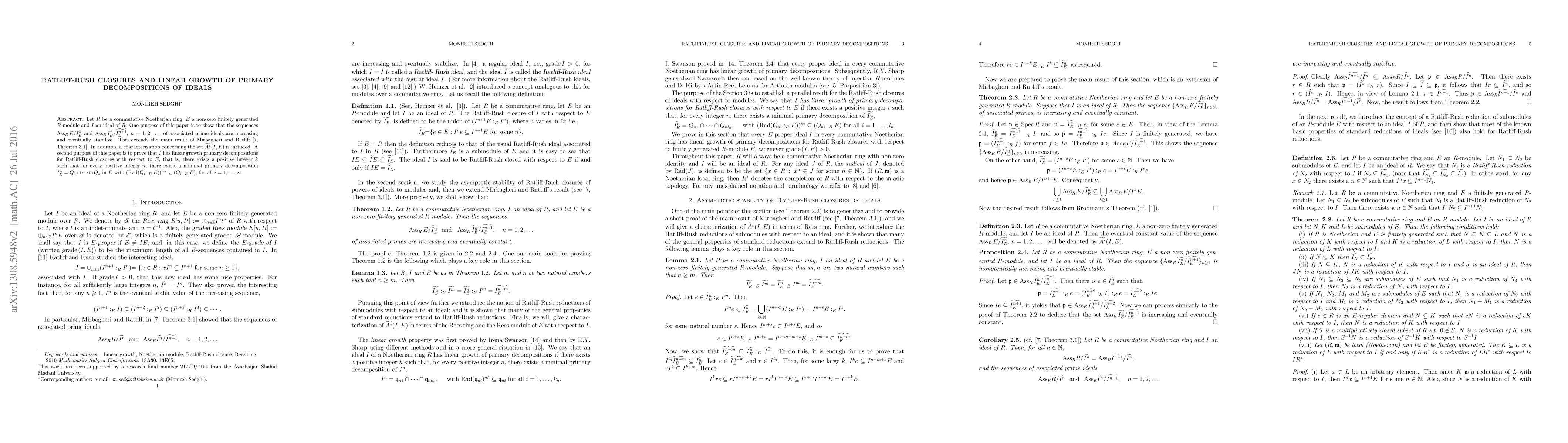 Let $R$ be a commutative Noetherian ring, $E$ a non-zero finitely generated $R$-module and $I$ an ideal of $R$. One purpose of this paper is to show that the sequences $\Ass_RE/ \widetilde{I_E^n}$ and $\Ass_R\widetilde{I^n _E}/\widetilde{I^{n+1}_E}$, $n = 1,2, \dots$, of associated prime ideals are increasing and eventually stabilize. This extends the main result of Mirbagheri and Ratliff \cite[Theorem 3.1]{MR}. In addition, a characterization concerning the set $\widetilde{A^*}(I,E)$ is included. A second purpose of this paper is to prove that $I$ has linear growth primary decompositions for Ratliff-Rush closures with respect to $E$, that is, there exists a positive integer $k$ such that for every positive integer $n$, there exists a minimal primary decomposition $\widetilde {I^n_E}= Q_1\cap \cdots\cap Q_s$ in $E$ with $(\Rad(Q_i:_RE))^{nk}\subseteq (Q_i:_R E)$, for all $i= 1, \dots, s$.