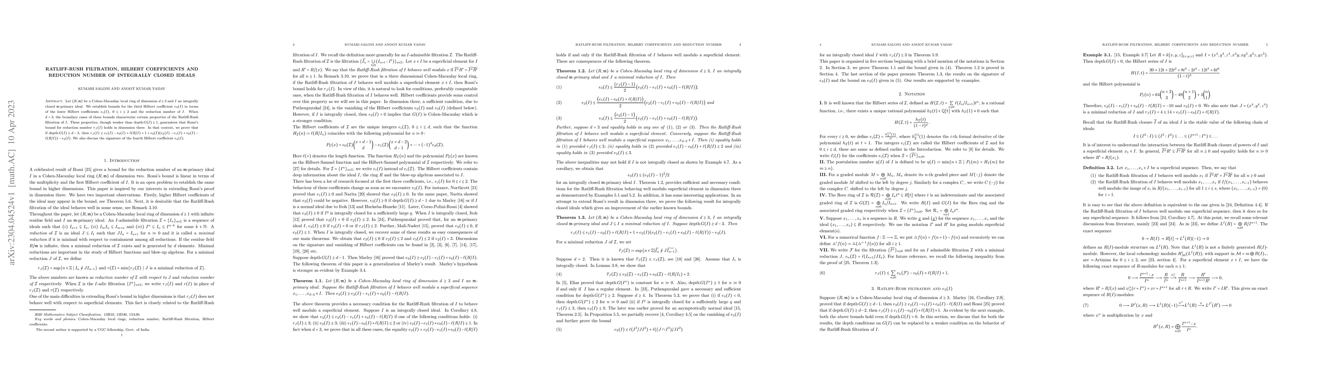 Let $(R,\mathfrak{m})$ be a Cohen-Macaulay local ring of dimension $d\geq 3$ and $I$ an integrally closed $\mathfrak{m}$-primary ideal. We establish bounds for the third Hilbert coefficient $e_3(I)$ in terms of the lower Hilbert coefficients $e_i(I),~0\leq i\leq 2$ and the reduction number of $I$. When $d=3$, the boundary cases of these bounds characterize certain properties of the Ratliff-Rush filtration of $I$. These properties, though weaker than depth $G(I)\geq 1$, guarantees that Rossi's bound for reduction number $r_J(I)$ holds in dimension three. In that context, we prove that if $depth G(I)\geq d-3$, then $r_J(I)\leq e_1(I)-e_0(I)+\ell(R/I)+1+e_2(I)(e_2(I)-e_1(I)+e_0(I)-\ell(R/I))-e_3(I).$ We also discuss the signature of the fourth Hilbert coefficient $e_4(I).$