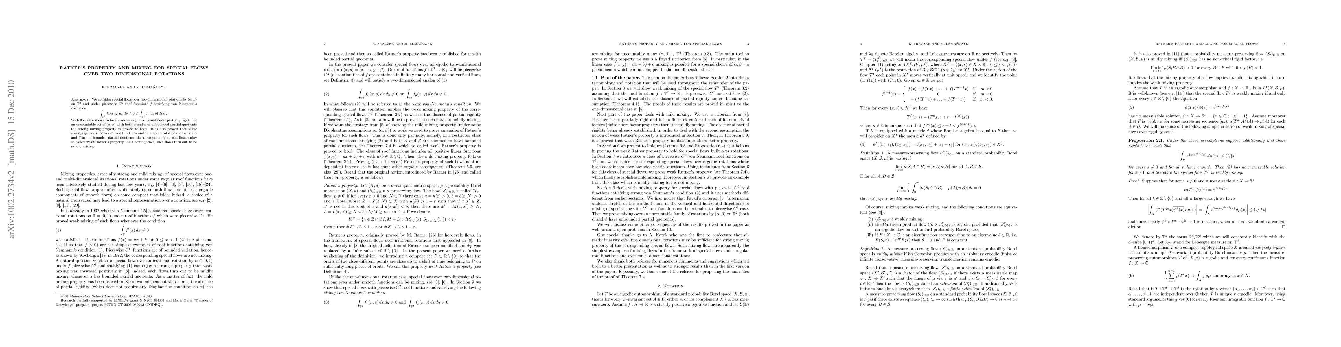 We consider special flows over two-dimensional rotations by $(\alpha,\beta)$ on $\T^2$ and under piecewise $C^2$ roof functions $f$ satisfying von Neumann's condition $\int_{\T^2}f_x(x,y)\,dx\,dy\neq 0\neq \int_{\T^2}f_y(x,y)\,dx\,dy.$ Such flows are shown to be always weakly mixing and never partially rigid. For an uncountable set of $(\alpha,\beta)$ with both $\alpha$ and $\beta$ of unbounded partial quotients the strong mixing property is proved to hold. It is also proved that while specifying to a subclass of roof functions and to ergodic rotations for which $\alpha$ and $\beta$ are of bounded partial quotients the corresponding special flows enjoy so called weak Ratner's property. As a consequence, such flows turn out to be mildly mixing.
