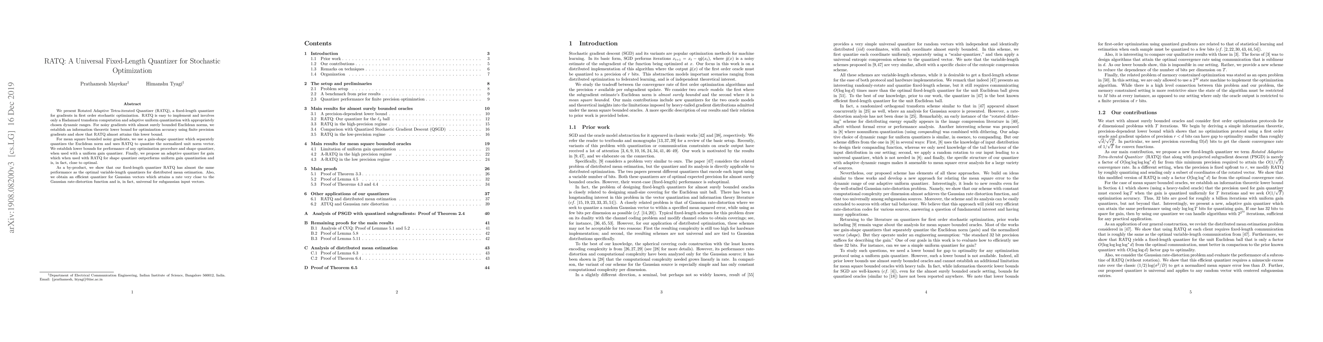 We present Rotated Adaptive Tetra-iterated Quantizer (RATQ), a fixed-length quantizer for gradients in first order stochastic optimization. RATQ is easy to implement and involves only a Hadamard transform computation and adaptive uniform quantization with appropriately chosen dynamic ranges. For noisy gradients with almost surely bounded Euclidean norms, we establish an information theoretic lower bound for optimization accuracy using finite precision gradients and show that RATQ almost attains this lower bound. For mean square bounded noisy gradients, we use a gain-shape quantizer which separately quantizes the Euclidean norm and uses RATQ to quantize the normalized unit norm vector. We establish lower bounds for performance of any optimization procedure and shape quantizer, when used with a uniform gain quantizer. Finally, we propose an adaptive quantizer for gain which when used with RATQ for shape quantizer outperforms uniform gain quantization and is, in fact, close to optimal. As a by-product, we show that our fixed-length quantizer RATQ has almost the same performance as the optimal variable-length quantizers for distributed mean estimation. Also, we obtain an efficient quantizer for Gaussian vectors which attains a rate very close to the Gaussian rate-distortion function and is, in fact, universal for subgaussian input vectors.