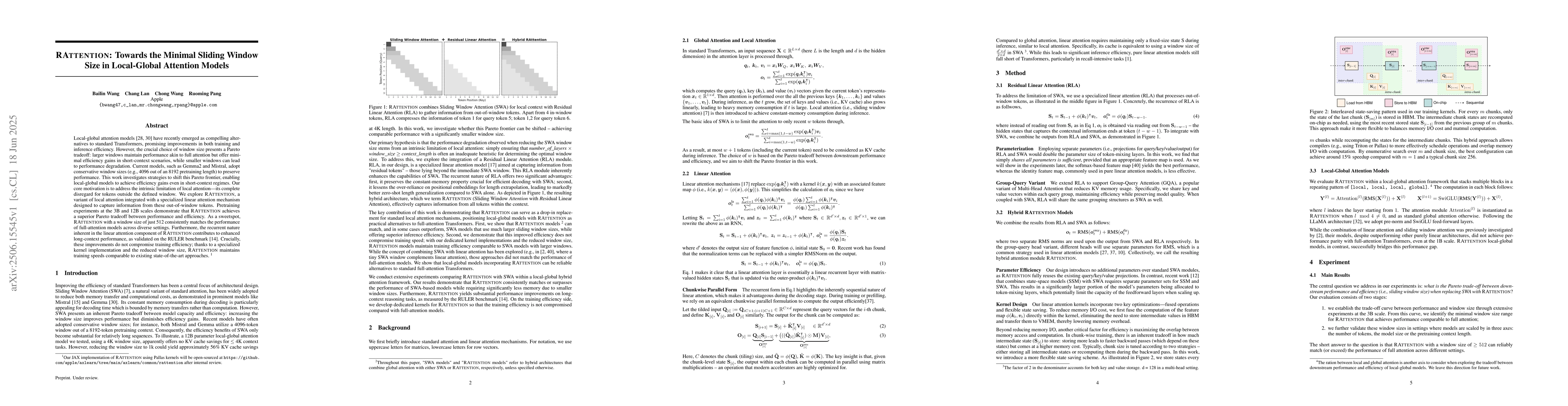 Local-global attention models have recently emerged as compelling alternatives to standard Transformers, promising improvements in both training and inference efficiency. However, the crucial choice of window size presents a Pareto tradeoff: larger windows maintain performance akin to full attention but offer minimal efficiency gains in short-context scenarios, while smaller windows can lead to performance degradation. Current models, such as Gemma2 and Mistral, adopt conservative window sizes (e.g., 4096 out of an 8192 pretraining length) to preserve performance. This work investigates strategies to shift this Pareto frontier, enabling local-global models to achieve efficiency gains even in short-context regimes. Our core motivation is to address the intrinsic limitation of local attention -- its complete disregard for tokens outside the defined window. We explore RATTENTION, a variant of local attention integrated with a specialized linear attention mechanism designed to capture information from these out-of-window tokens. Pretraining experiments at the 3B and 12B scales demonstrate that RATTENTION achieves a superior Pareto tradeoff between performance and efficiency. As a sweet spot, RATTENTION with a window size of just 512 consistently matches the performance of full-attention models across diverse settings. Furthermore, the recurrent nature inherent in the linear attention component of RATTENTION contributes to enhanced long-context performance, as validated on the RULER benchmark. Crucially, these improvements do not compromise training efficiency; thanks to a specialized kernel implementation and the reduced window size, RATTENTION maintains training speeds comparable to existing state-of-the-art approaches.