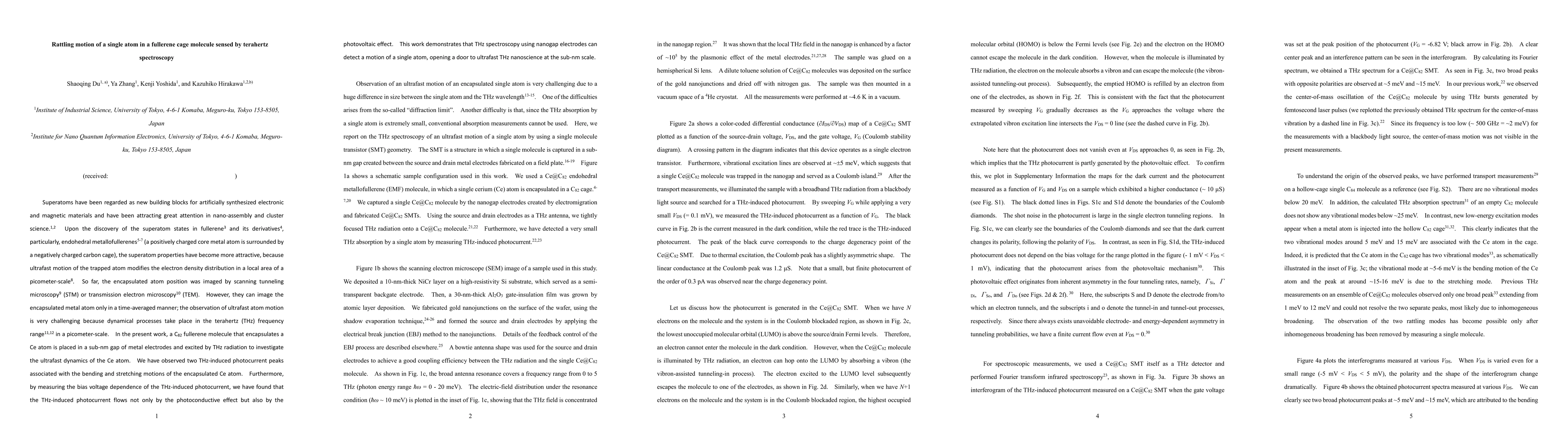 This paper reports on the use of terahertz spectroscopy to detect the ultrafast motion of a single Ce atom within a fullerene cage using a single molecule transistor geometry. The observed photocurrent peaks indicate the bending and stretching motions of the atom, showcasing the potential of THz spectroscopy for picometer-scale ultrafast nanoscience.