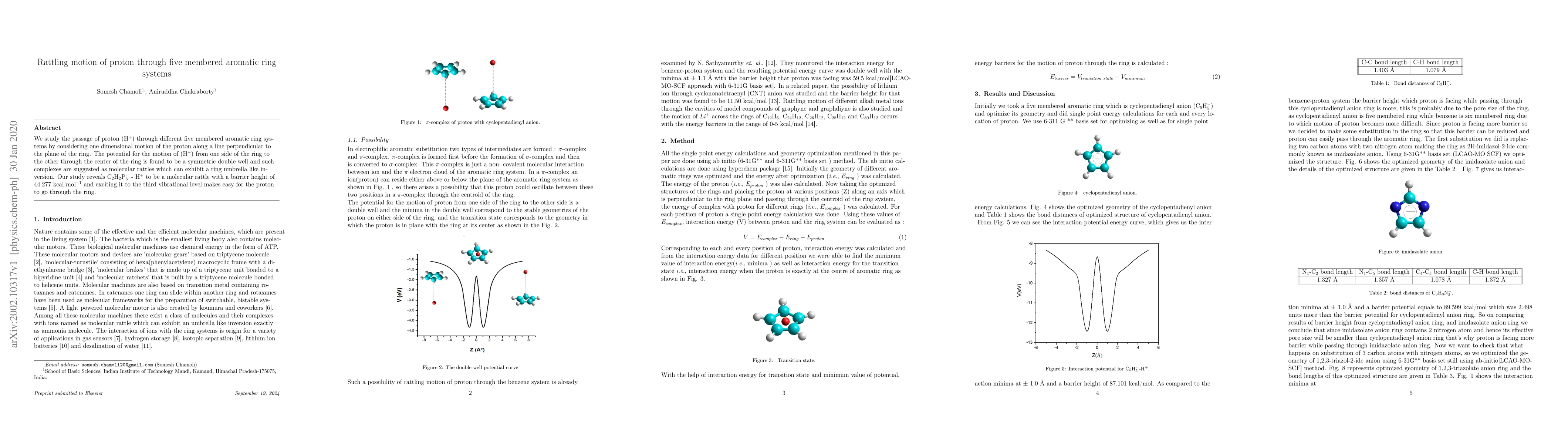This research investigates the proton's motion through five-membered aromatic rings, finding it behaves like a molecular rattle with a symmetric double well potential. Specifically, C$_{2}$H$_{2}$P$_{3}^{-}$ - H$^{+}$ exhibits a barrier height of 44.277 kcal mol$^{-1}$, and excitation to higher vibrational levels facilitates proton passage.
