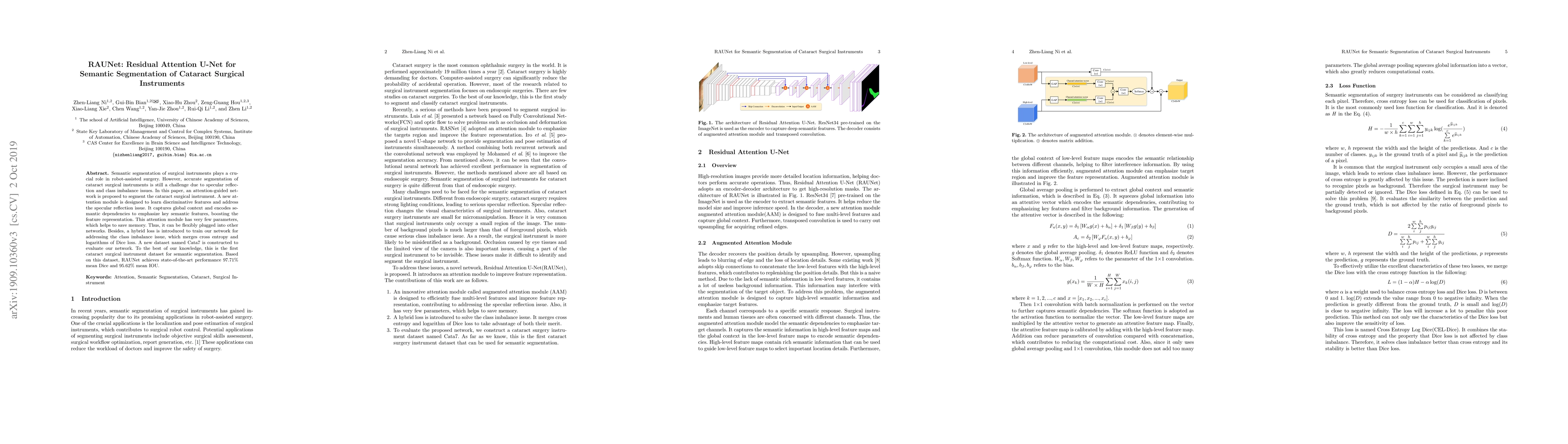 RAUNet, an attention-guided network with a novel attention module, achieves state-of-the-art performance in semantic segmentation of cataract surgical instruments, addressing specular reflections and class imbalance issues. The new Cata7 dataset facilitates this advancement.