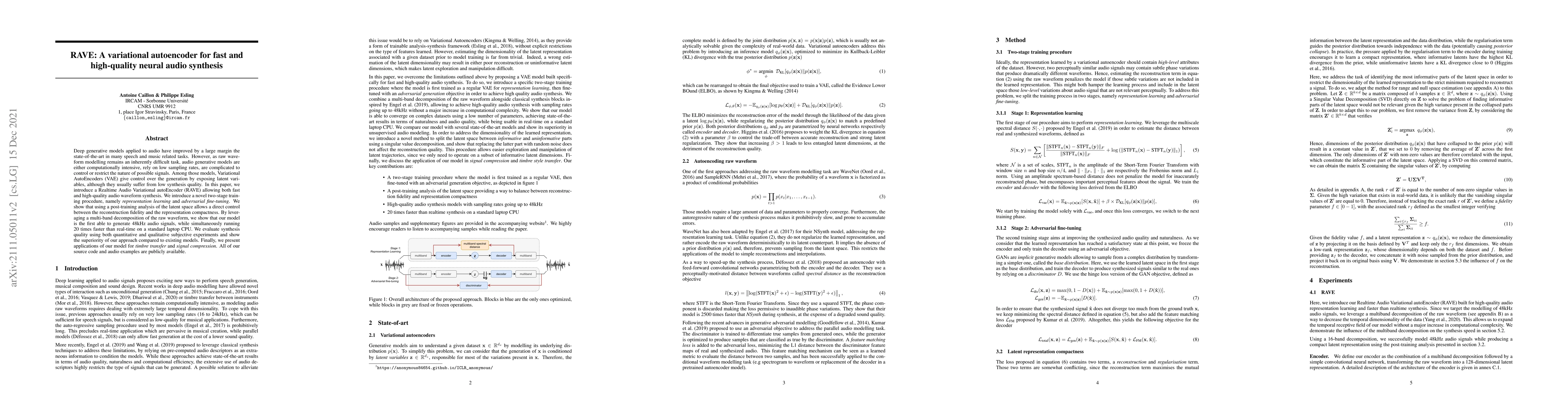 The RAVE model introduces a Variational AutoEncoder for fast and high-quality neural audio synthesis, achieving 48kHz audio generation at 20x faster than real-time on a standard laptop CPU. It employs a two-stage training procedure and a multi-band decomposition to balance synthesis quality and computational efficiency.