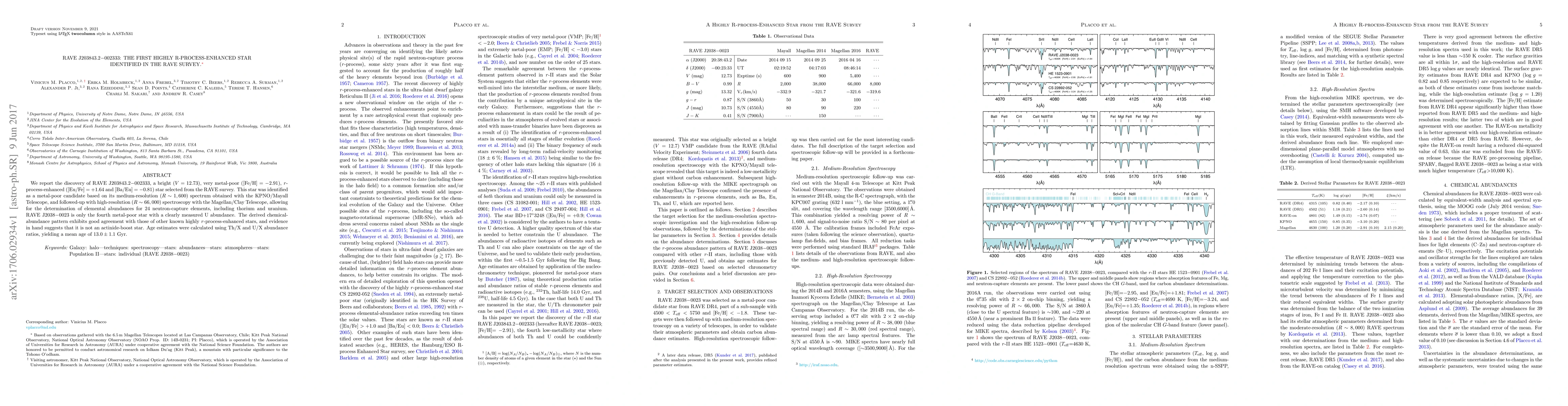 RAVE J203843.2-002333 is the first highly r-process-enhanced star identified in the RAVE survey, characterized by a very metal-poor composition and significant abundances of heavy elements, including thorium and uranium, with an estimated age of 13.0 Gyr. This star's elemental pattern aligns with other known r-process-enhanced stars, suggesting it is not an actinide-boost star.