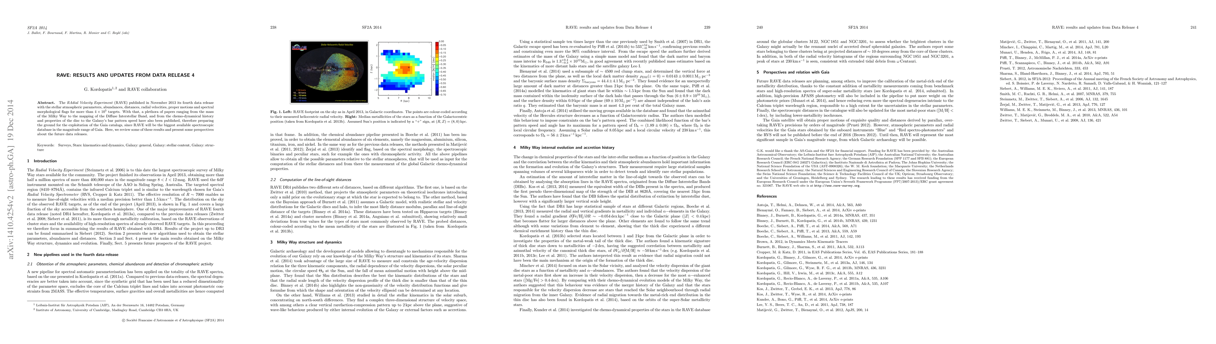 The RAdial Velocity Experiment (RAVE) released its fourth data set in 2013, providing extensive stellar data for over 480,000 targets, facilitating numerous studies on the Milky Way's mass, interstellar bands, and galactic structure. This large spectroscopic survey has significantly contributed to the groundwork for future Gaia catalog analyses.
