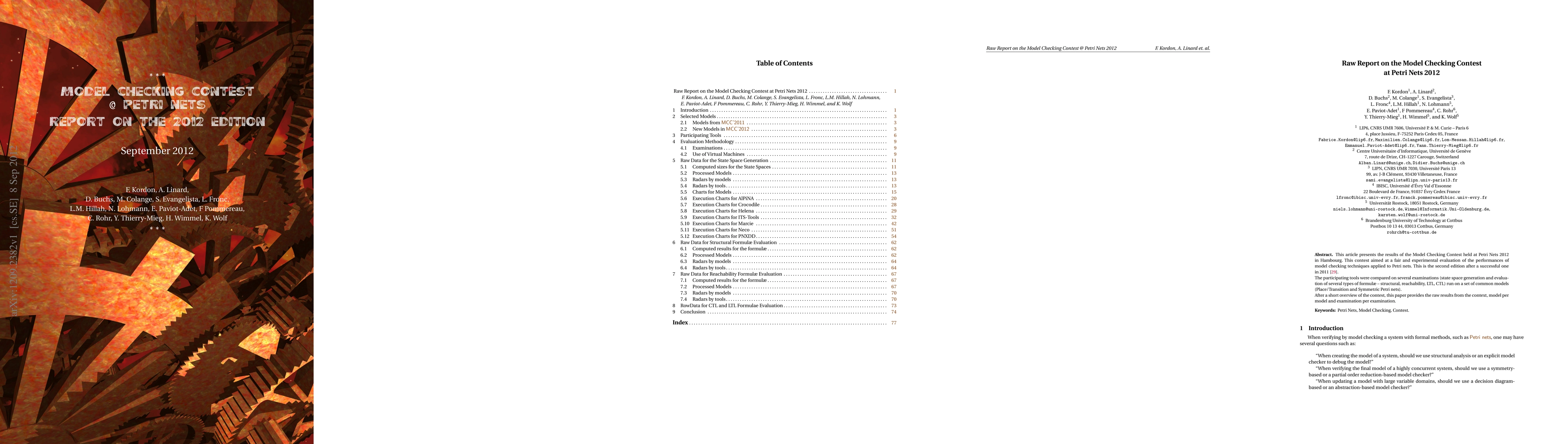 This paper reports the results of the 2012 Model Checking Contest held at Petri Nets in Hamburg, comparing the performance of various model checking tools on different types of formulae and common Petri net models. It presents detailed raw results from the contest, organized by context, model, and examination type.