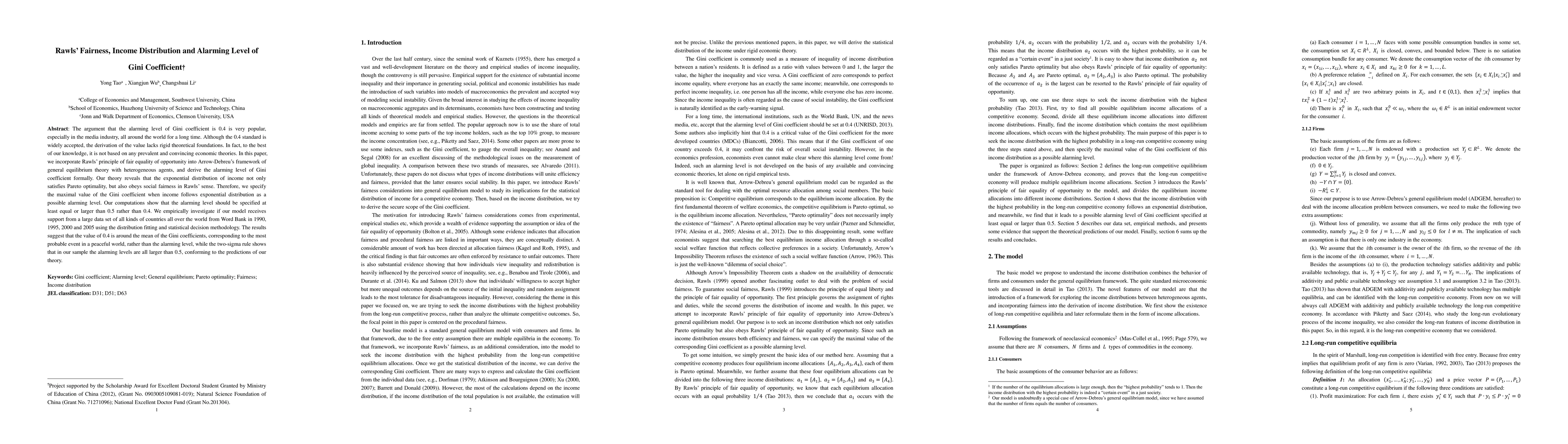 The argument that the alarming level of Gini coefficient is 0.4 is very popular, especially in the media industry, all around the world for a long time. Although the 0.4 standard is widely accepted, the derivation of the value lacks rigid theoretical foundations. In fact, to the best of our knowledge, it is not based on any prevalent and convincing economic theories. In this paper, we incorporate Rawls' principle of fair equality of opportunity into Arrow-Debreu's framework of general equilibrium theory with heterogeneous agents, and derive the alarming level of Gini coefficient formally. Our theory reveals that the exponential distribution of income not only satisfies Pareto optimality, but also obeys social fairness in Rawls' sense. Therefore, we specify the maximal value of the Gini coefficient when income follows exponential distribution as a possible alarming level. Our computations show that the alarming level should be specified at least equal or larger than 0.5 rather than 0.4. We empirically investigate if our model receives support from a large data set of all kinds of countries all over the world from Word Bank in 1990, 1995, 2000 and 2005 using the distribution fitting and statistical decision methodology. The results suggest that the value of 0.4 is around the mean of the Gini coefficients, corresponding to the most probable event in a peaceful world, rather than the alarming level, while the two-sigma rule shows that in our sample the alarming levels are all larger than 0.5, conforming to the predictions of our theory.