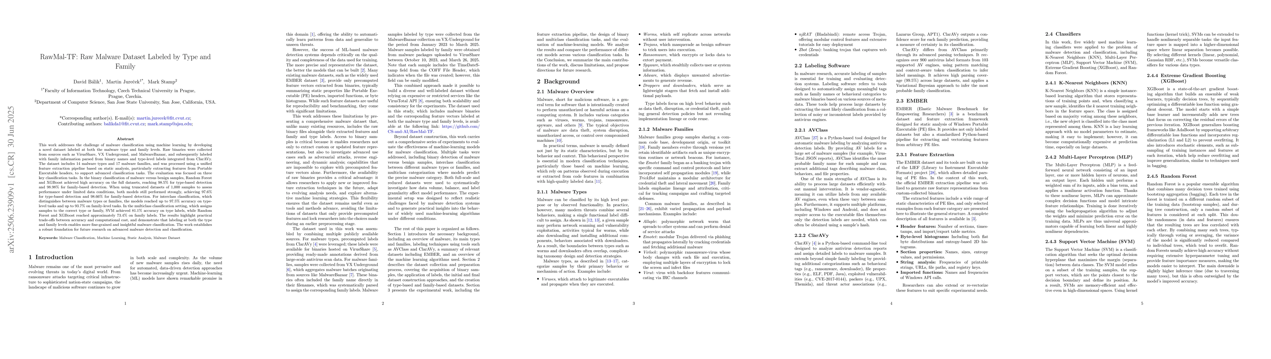 This work addresses the challenge of malware classification using machine learning by developing a novel dataset labeled at both the malware type and family levels. Raw binaries were collected from sources such as VirusShare, VX Underground, and MalwareBazaar, and subsequently labeled with family information parsed from binary names and type-level labels integrated from ClarAVy. The dataset includes 14 malware types and 17 malware families, and was processed using a unified feature extraction pipeline based on static analysis, particularly extracting features from Portable Executable headers, to support advanced classification tasks. The evaluation was focused on three key classification tasks. In the binary classification of malware versus benign samples, Random Forest and XGBoost achieved high accuracy on the full datasets, reaching 98.5% for type-based detection and 98.98% for family-based detection. When using truncated datasets of 1,000 samples to assess performance under limited data conditions, both models still performed strongly, achieving 97.6% for type-based detection and 98.66% for family-based detection. For interclass classification, which distinguishes between malware types or families, the models reached up to 97.5% accuracy on type-level tasks and up to 93.7% on family-level tasks. In the multiclass classification setting, which assigns samples to the correct type or family, SVM achieved 81.1% accuracy on type labels, while Random Forest and XGBoost reached approximately 73.4% on family labels. The results highlight practical trade-offs between accuracy and computational cost, and demonstrate that labeling at both the type and family levels enables more fine-grained and insightful malware classification. The work establishes a robust foundation for future research on advanced malware detection and classification.