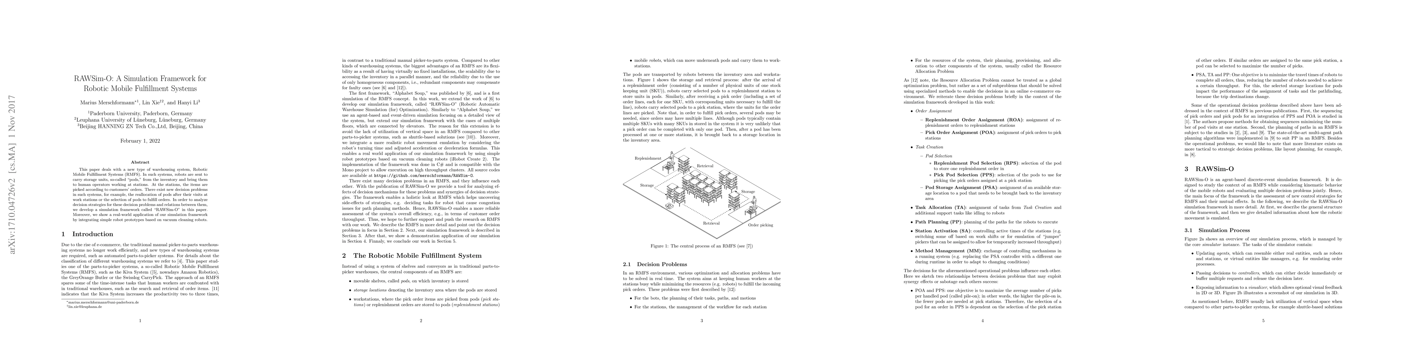 This paper presents RAWSim-O, a simulation framework for analyzing Robotic Mobile Fulfillment Systems (RMFS), which use robots to transport storage units to human operators for order fulfillment. The framework is demonstrated through a real-world application with prototype robots based on vacuum cleaning robots.