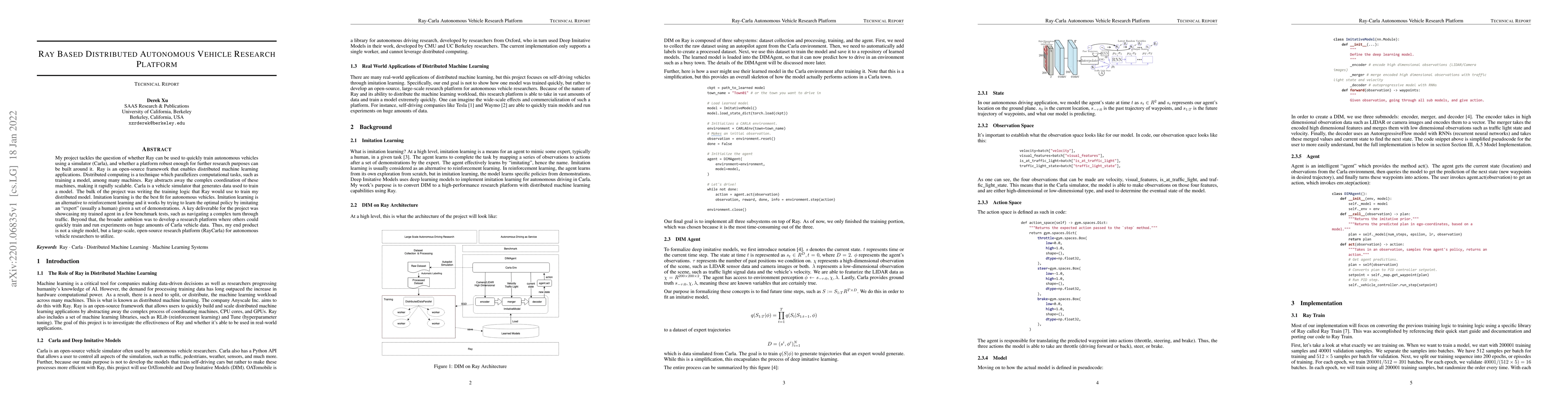 My project tackles the question of whether Ray can be used to quickly train autonomous vehicles using a simulator (Carla), and whether a platform robust enough for further research purposes can be built around it. Ray is an open-source framework that enables distributed machine learning applications. Distributed computing is a technique which parallelizes computational tasks, such as training a model, among many machines. Ray abstracts away the complex coordination of these machines, making it rapidly scalable. Carla is a vehicle simulator that generates data used to train a model. The bulk of the project was writing the training logic that Ray would use to train my distributed model. Imitation learning is the best fit for autonomous vehicles. Imitation learning is an alternative to reinforcement learning and it works by trying to learn the optimal policy by imitating an expert (usually a human) given a set of demonstrations. A key deliverable for the project was showcasing my trained agent in a few benchmark tests, such as navigating a complex turn through traffic. Beyond that, the broader ambition was to develop a research platform where others could quickly train and run experiments on huge amounts of Carla vehicle data. Thus, my end product is not a single model, but a large-scale, open-source research platform (RayCarla) for autonomous vehicle researchers to utilize.