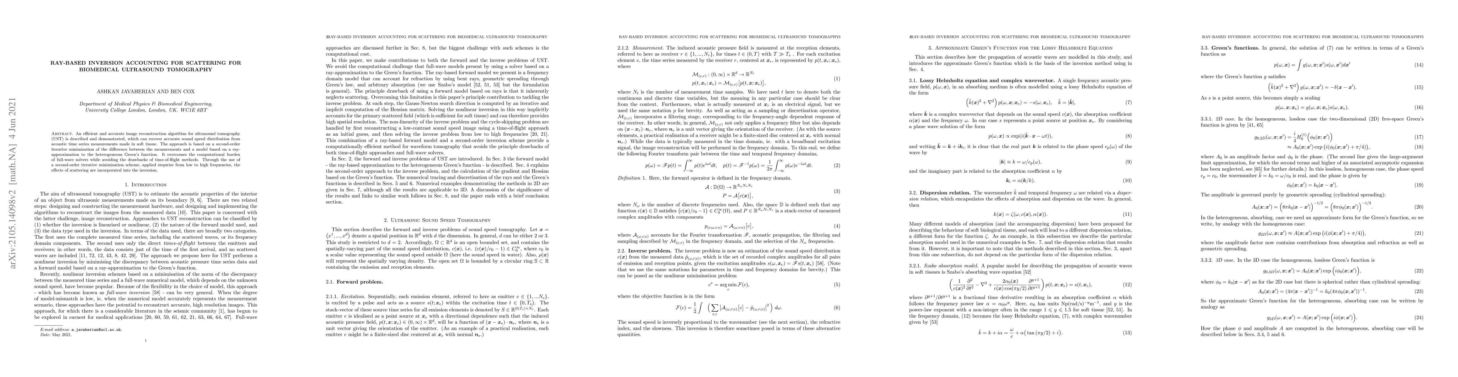 An efficient and accurate image reconstruction algorithm for ultrasound tomography (UST) is described and demonstrated, which can recover accurate sound speed distribution from acoustic time series measurements made in soft tissue. The approach is based on a second-order iterative minimisation of the difference between the measurements and a model based on a ray-approximation to the heterogeneous Green's function. It overcomes the computational burden of full-wave solvers while avoiding the drawbacks of time-of-flight methods. Through the use of a second-order iterative minimisation scheme, applied stepwise from low to high frequencies, the effects of scattering are incorporated into the inversion.