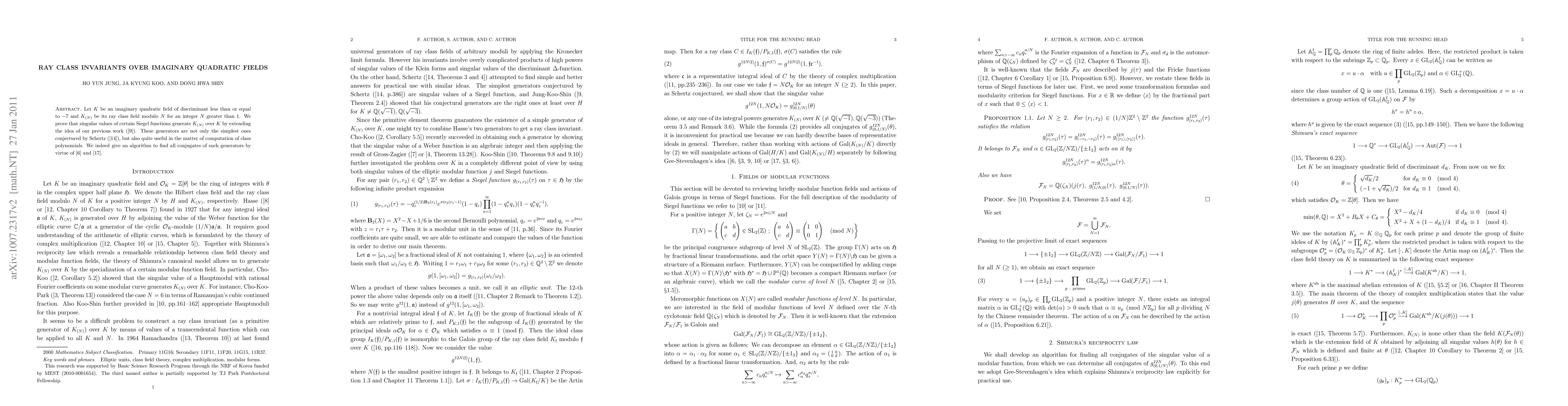 This paper proves that singular values of certain Siegel functions generate ray class fields $K_{(N)}$ over imaginary quadratic fields $K$ of discriminant ≤ -7, extending previous work. An algorithm is provided for computing these generators, which are useful for determining class polynomials.