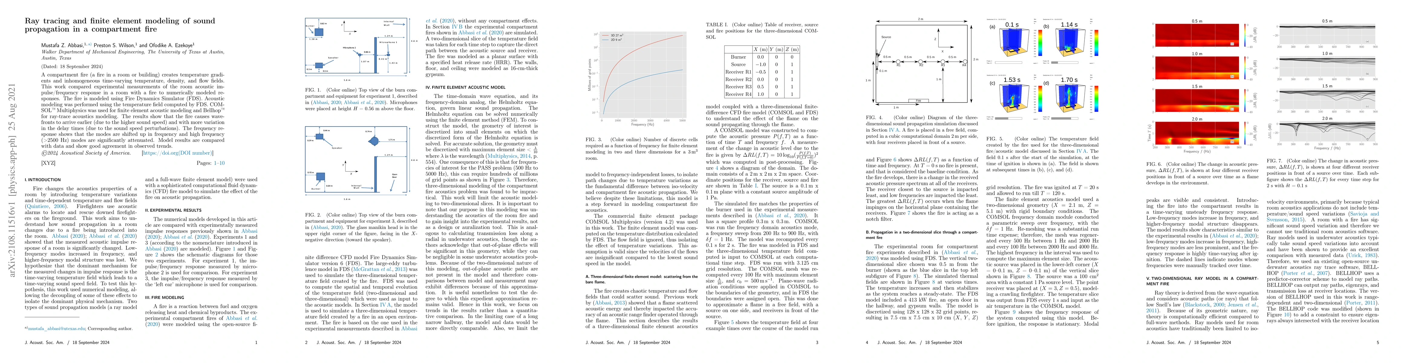 This paper compares experimental acoustic measurements in a compartment fire with numerical models using FDS and COMSOL Multiphysics for finite element modeling and Bellhop for ray-tracing. Results show that the fire causes earlier wave-front arrivals and increased delay time variations due to higher sound speed and perturbations, with high-frequency modes significantly attenuated.