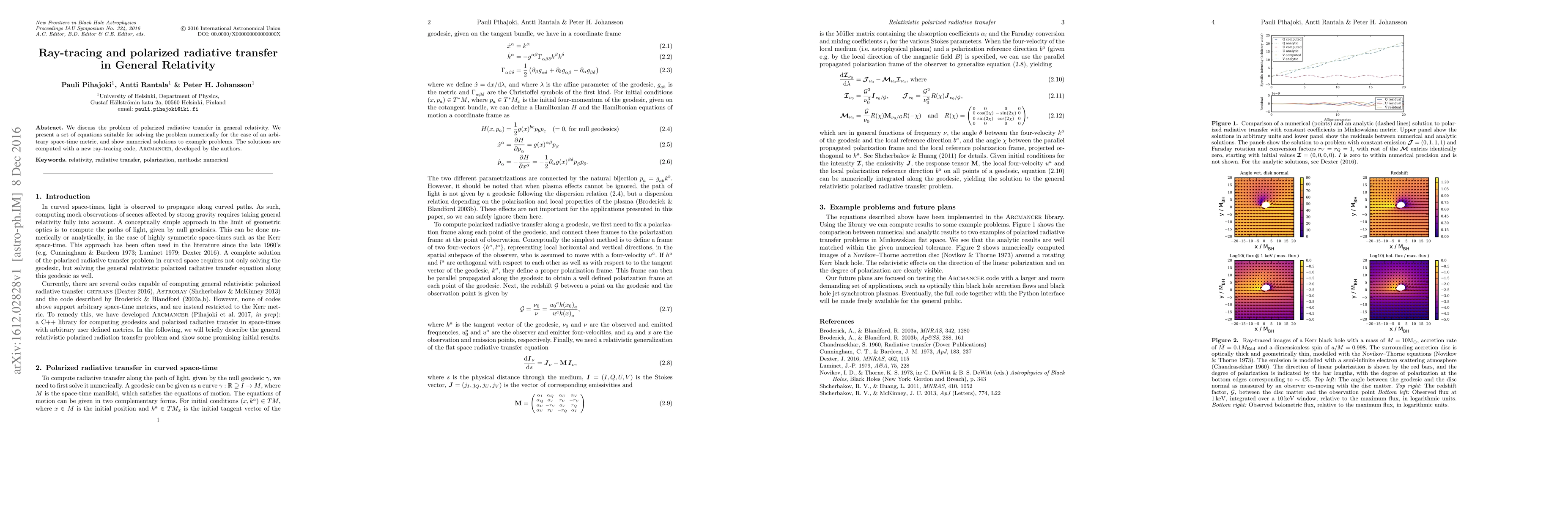 This paper presents equations for polarized radiative transfer in general relativity and introduces Arcmancer, a new ray-tracing code, to numerically solve these equations for arbitrary space-time metrics, demonstrating its effectiveness through example problems.