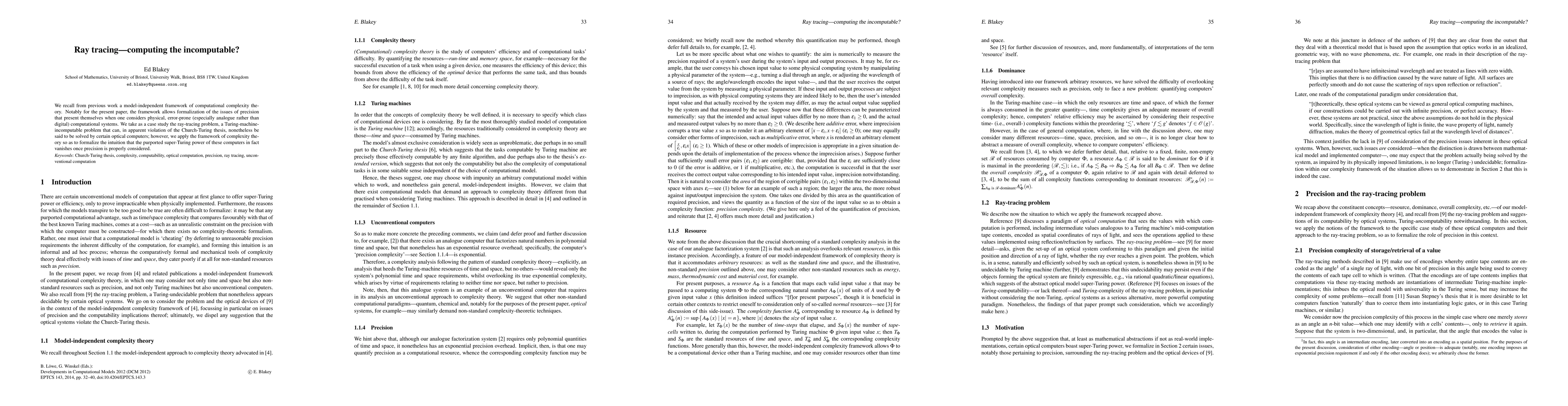 We recall from previous work a model-independent framework of computational complexity theory. Notably for the present paper, the framework allows formalization of the issues of precision that present themselves when one considers physical, error-prone (especially analogue rather than digital) computational systems. We take as a case study the ray-tracing problem, a Turing-machine-incomputable problem that can, in apparent violation of the Church-Turing thesis, nonetheless be said to be solved by certain optical computers; however, we apply the framework of complexity theory so as to formalize the intuition that the purported super-Turing power of these computers in fact vanishes once precision is properly considered.