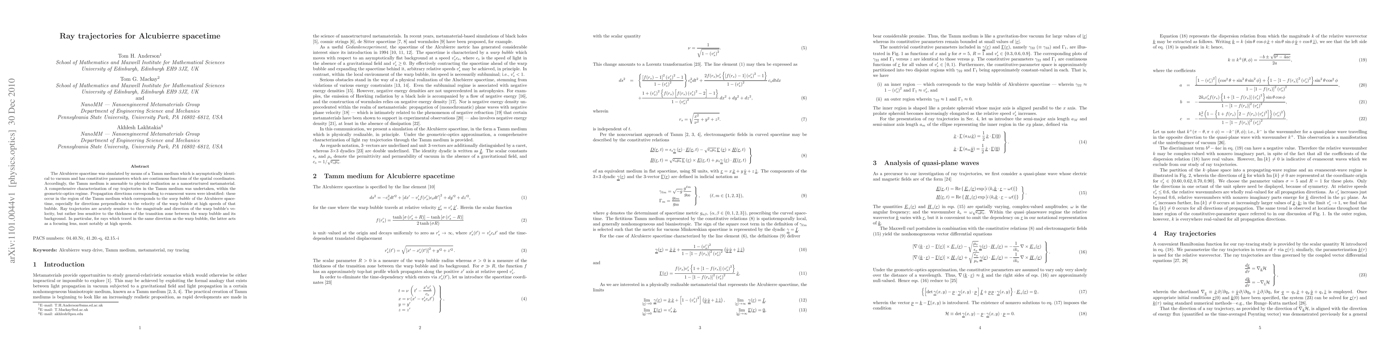 The Alcubierre spacetime was simulated by means of a Tamm medium which is asymptotically identical to vacuum and has constitutive parameters which are ontinuous functions of the spatial coordinates. Accordingly, the Tamm medium is amenable to physical realization as a nanostructured metamaterial. A comprehensive characterization of ray trajectories in the Tamm medium was undertaken, within the geometric-optics regime. Propagation directions corresponding to evanescent waves were identified: these occur in the region of the Tamm medium which corresponds to the warp bubble of the Alcubierre spacetime, especially for directions perpendicular to the velocity of the warp bubble at high speeds of that bubble. Ray trajectories are acutely sensitive to the magnitude and direction of the warp bubble's velocity, but rather less sensitive to the thickness of the transition zone between the warp bubble and its background. In particular, for rays which travel in the same direction as the warp bubble, the latter acts as a focusing lens, most notably at high speeds.