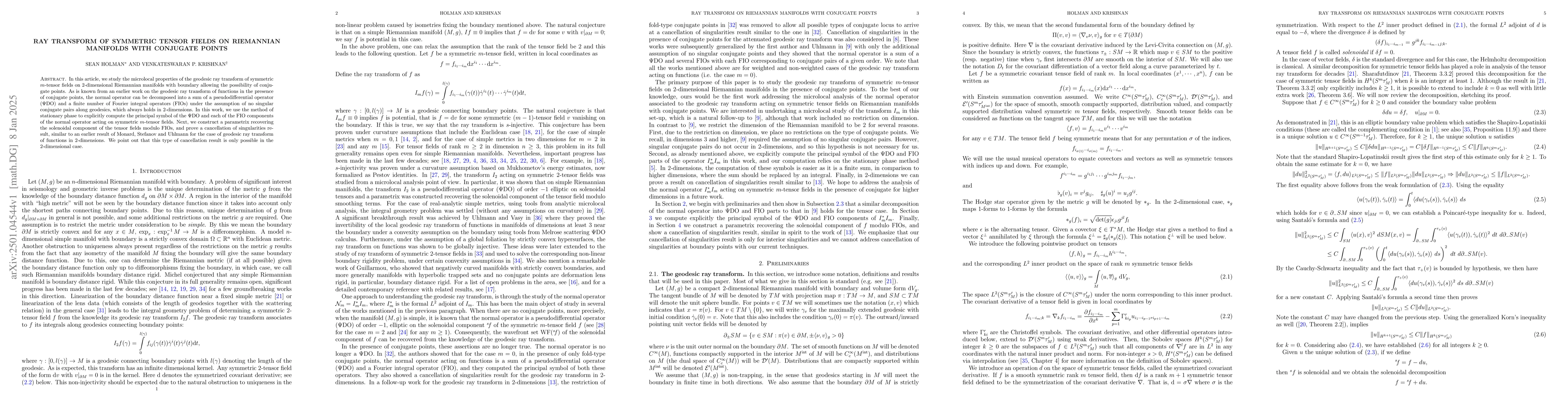 This paper investigates the microlocal properties of the geodesic ray transform for symmetric tensor fields on 2D Riemannian manifolds with boundaries, allowing for conjugate points. It decomposes the normal operator into a pseudodifferential operator and Fourier integral operators, computes their principal symbols, constructs a parametrix, and proves a singularity cancellation result specific to 2-dimensions.
