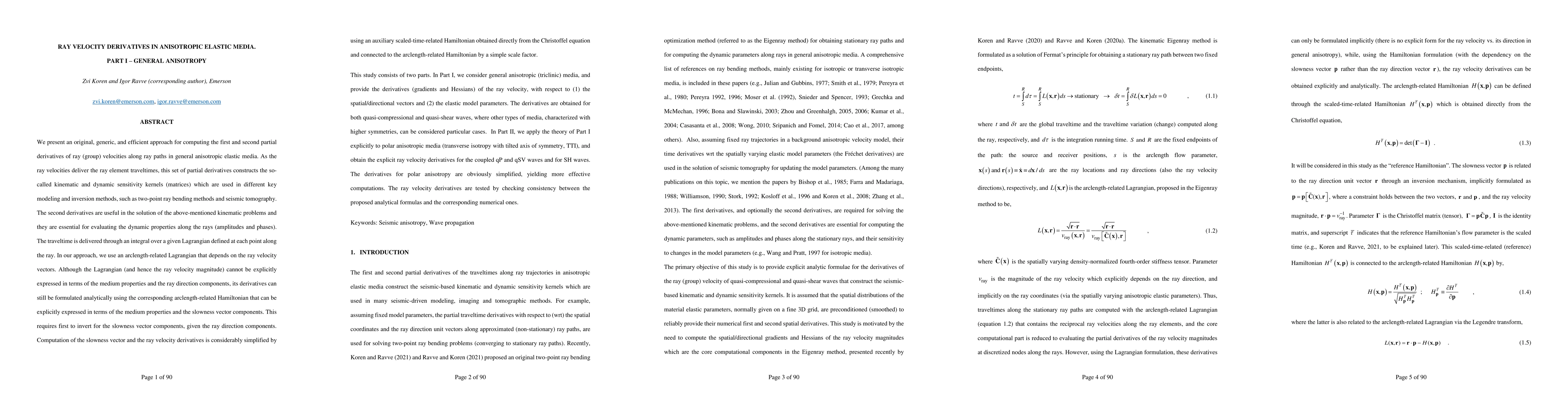 We present an original, generic, and efficient approach for computing the first and second partial derivatives of ray velocities along ray paths in general anisotropic elastic media. These derivatives are used in solving kinematic problems, like two-point ray bending methods and seismic tomography, and they are essential for evaluating the dynamic properties along the rays (amplitudes and phases). The traveltime is delivered through an integral over a given Lagrangian defined at each point along the ray. Although the Lagrangian cannot be explicitly expressed in terms of the medium properties and the ray direction components, its derivatives can still be formulated analytically using the corresponding arclength-related Hamiltonian that can be explicitly expressed in terms of the medium properties and the slowness vector components. This requires first to invert for the slowness vector components, given the ray direction components. Computation of the slowness vector and the ray velocity derivatives is considerably simplified by using an auxiliary scaled-time-related Hamiltonian obtained directly from the Christoffel equation and connected to the arclength-related Hamiltonian by a simple scale factor. This study consists of two parts. In Part I, we consider general anisotropic (triclinic) media, and provide the derivatives (gradients and Hessians) of the ray velocity, with respect to (1) the spatial/directional vectors and (2) the elastic model parameters. In Part II, we apply the theory of Part I explicitly to polar anisotropic media (transverse isotropy with tilted axis of symmetry, TTI), and obtain the explicit ray velocity derivatives for the coupled qP and qSV waves and for SH waves.