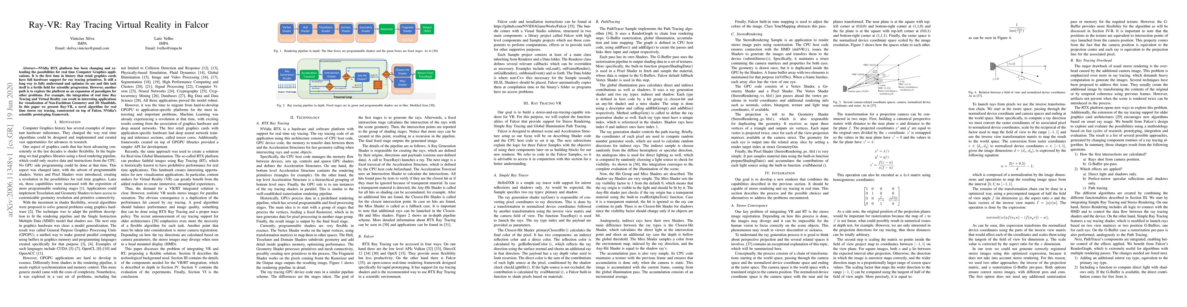 This paper introduces Ray-VR, a novel algorithm for real-time stereo ray tracing leveraging NVidia's RTX platform and Falcor framework, aiming to explore the integration of real-time ray tracing with virtual reality for visualizing non-Euclidean geometry and 3D manifolds. The work aims to extend the paradigm of ray tracing into virtual reality applications.