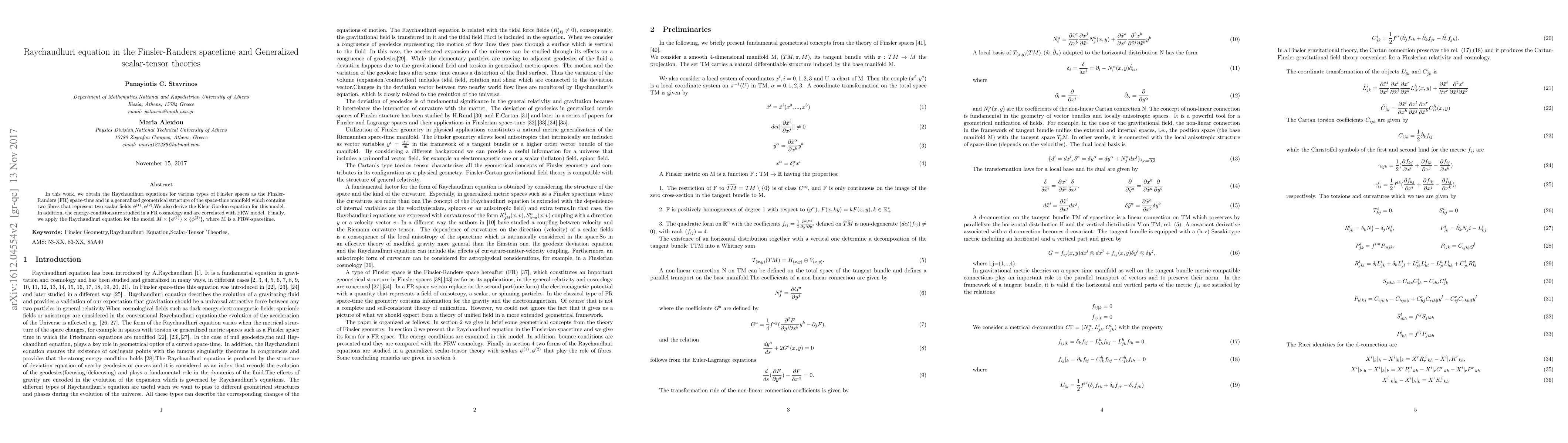 This paper derives the Raychaudhuri equations for Finsler-Randers spacetimes and generalized scalar-tensor theories, exploring their implications in FR cosmology. It also correlates energy conditions with the Friedmann-Robertson-Walker (FRW) model and applies the Raychaudhuri equation to a cosmological model involving two inflaton fields.