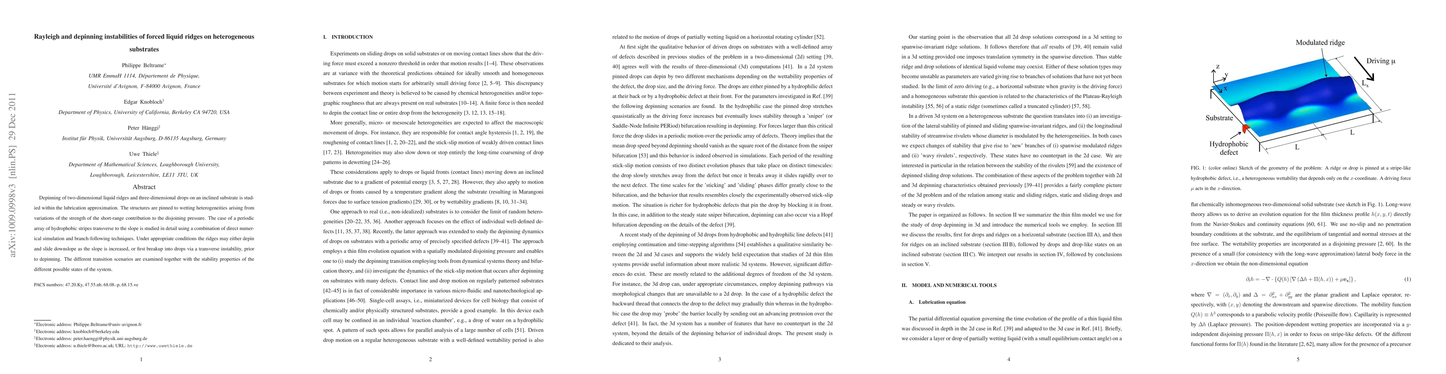 This paper investigates the depinning and Rayleigh instabilities of liquid ridges on heterogeneous substrates, focusing on the lubrication approximation. It explores how ridges pinned by wetting heterogeneities may either slide downslope or break into drops before depinning, analyzing various transition scenarios and stability properties.
