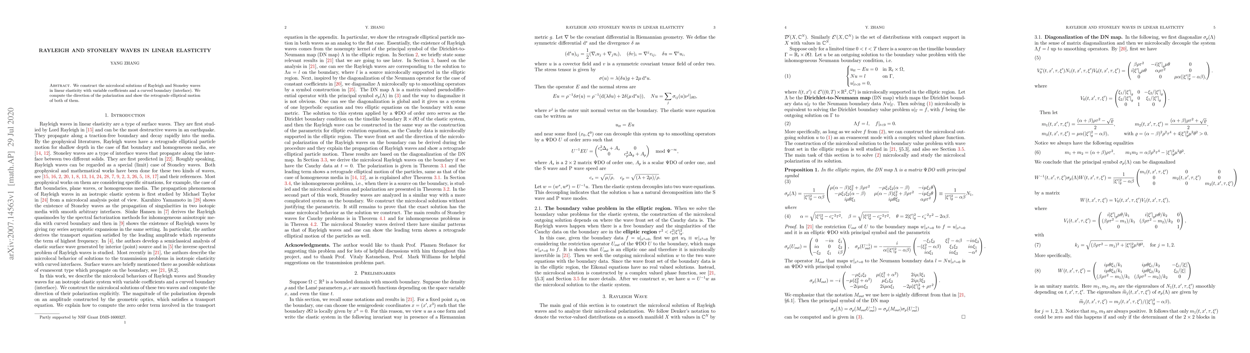 The paper constructs microlocal solutions for Rayleigh and Stoneley waves in linear elasticity with variable coefficients and a curved boundary, computing the polarization direction and demonstrating retrograde elliptical motion.