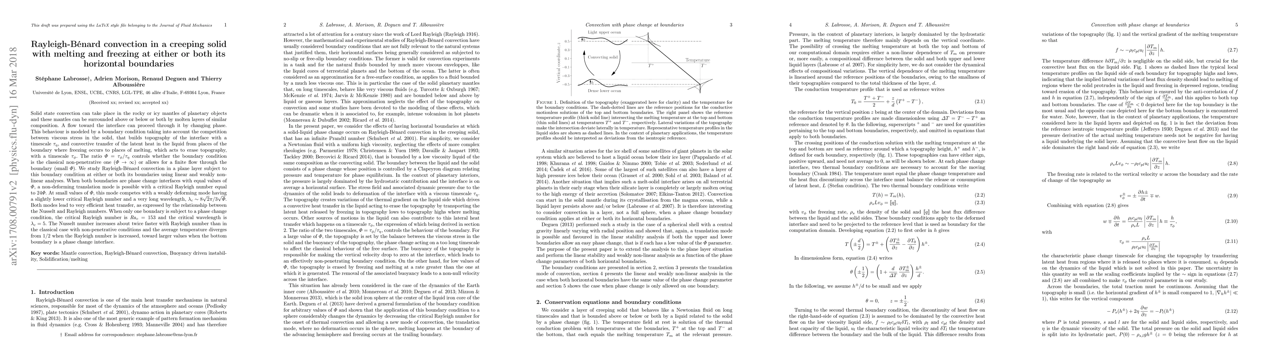 This paper investigates Rayleigh-Bénard convection in a creeping solid with melting and freezing at its horizontal boundaries, modeling the interplay between viscous stress and latent heat transfer. It finds that efficient heat transfer modes emerge, with critical Rayleigh numbers and wavelengths dependent on the phase change boundary conditions.