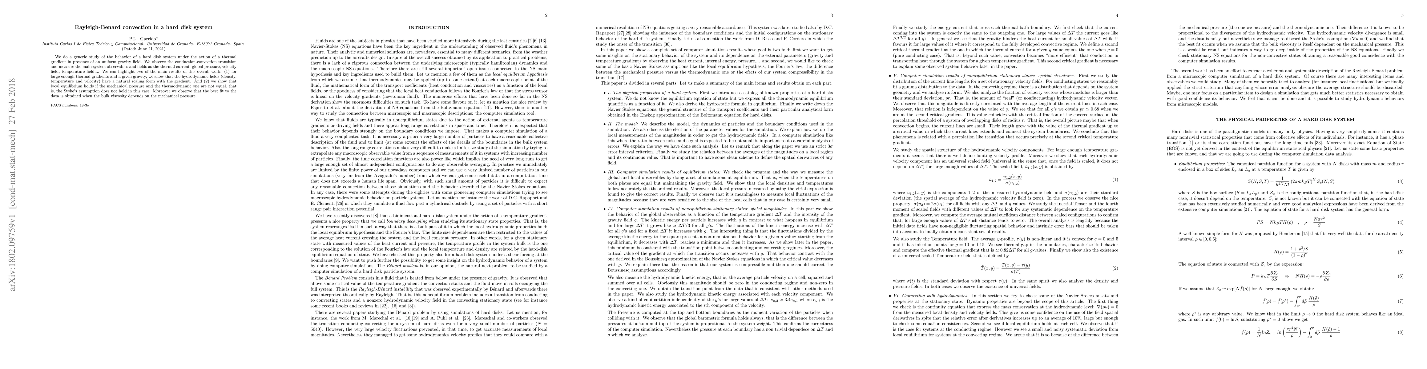 We do a generic study of the behavior of a hard disk system under the action of a thermal gradient in presence of an uniform gravity field. We observe the conduction-convection transition and measure the main system observables and fields as the thermal current, global pressure, velocity field, temperature field,... We can highlight two of the main results of this overall work: (1) for large enough thermal gradients and a given gravity, we show that the hydrodynamic fields (density, temperature and velocity) have a natural scaling form with the gradient. And (2) we show that local equilibrium holds if the mechanical pressure and the thermodynamic one are not equal, that is, the Stoke's assumption does not hold in this case. Moreover we observe that the best fit to the data is obtained when the bulk viscosity depends on the mechanical pressure.