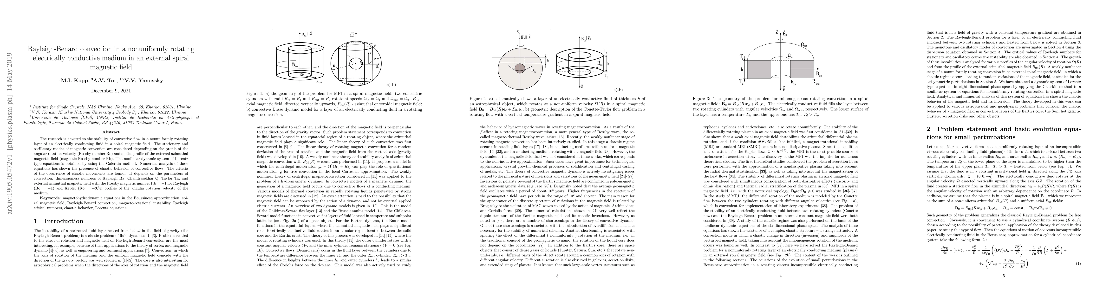 The research is devoted to the stability of convective flow in a nonuniformly rotating layer of an electrically conducting fluid in a spiral magnetic field. The stationary and oscillatory modes of magnetic convection are considered depending on the profile of the angular rotation velocity (Rossby number $\textrm{Ro}$) and on the profile of the external azimuthal magnetic field (magnetic Rossby number $\textrm{Rb}$). The nonlinear dynamic system of Lorentz type equations is obtained by using the Galerkin method. Numerical analysis of these equations has shown the presence of chaotic behavior of convective flows. The criteria of the occurrence of chaotic movements are found. It depends on the parameters of convection: dimensionless numbers of Rayleigh $\textrm{Ra}$, Chandrasekhar $\textrm{Q}$, Taylor $\textrm{Ta}$, and external azimuthal magnetic field with the Rossby magnetic number $\textrm{Rb}=-1$ for Rayleigh $(\textrm{Ro}=-1)$ and Kepler $(\textrm{Ro}=-3/4)$ profiles of the angular rotation velocity of the medium.