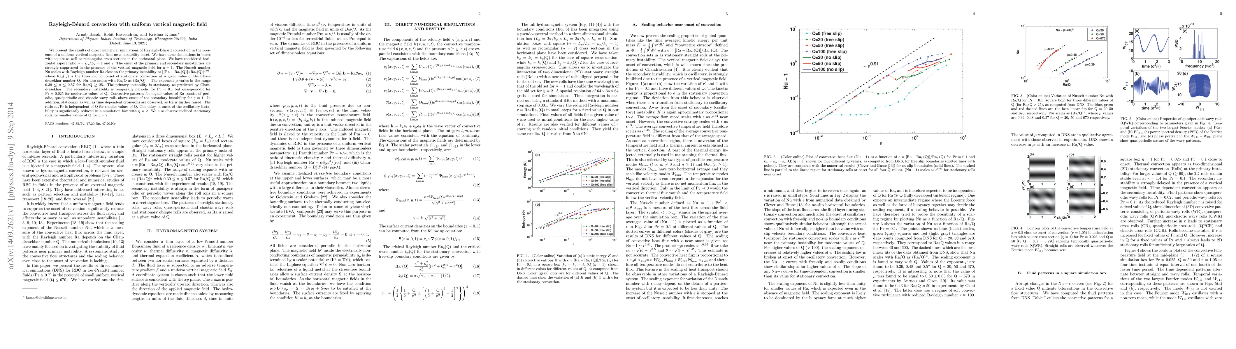 We present the results of direct numerical simulations of Rayleigh-B\'enard convection in the presence of a uniform vertical magnetic field near instability onset. We have done simulations in boxes with square as well as rectangular cross-sections in the horizontal plane. We have considered horizontal aspect ratio $\eta = L_y/L_x =1$ and $2$. The onset of the primary and secondary instabilities are strongly suppressed in the presence of the vertical magnetic field for $\eta =1$. The Nusselt number $\mathrm{Nu}$ scales with Rayleigh number $\mathrm{Ra}$ close to the primary instability as $[\mathrm{\{Ra - Ra_c (Q)\}/Ra_c (Q)} ]^{0.91}$, where $\mathrm{Ra_c (Q)}$ is the threshold for onset of stationary convection at a given value of the Chandrasekhar number $\mathrm{Q}$. $\mathrm{Nu}$ also scales with $\mathrm{Ra/Q}$ as $(\mathrm{Ra/Q})^{\mu}$. The exponent $\mu$ varies in the range $0.39 \le \mu \le 0.57$ for $\mathrm{Ra/Q} \ge 25$. The primary instability is stationary as predicted by Chandrasekhar. The secondary instability is temporally periodic for $\mathrm{Pr}=0.1$ but quasiperiodic for $\mathrm{Pr} = 0.025$ for moderate values of $\mathrm{Q}$. Convective patterns for higher values of $\mathrm{Ra}$ consist of periodic, quasiperiodic and chaotic wavy rolls above onset of the secondary instability for $\eta=1$. In addition, stationary as well as time dependent cross-rolls are observed, as $\mathrm{Ra}$ is further raised. The ratio $r_{\circ}/\mathrm{Pr}$ is independent of $\mathrm{Q}$ for smaller values of $\mathrm{Q}$. The delay in onset of the oscillatory instability is significantly reduced in a simulation box with $\eta =2$. We also observe inclined stationary rolls for smaller values of $\mathrm{Q}$ for $\eta =2$.