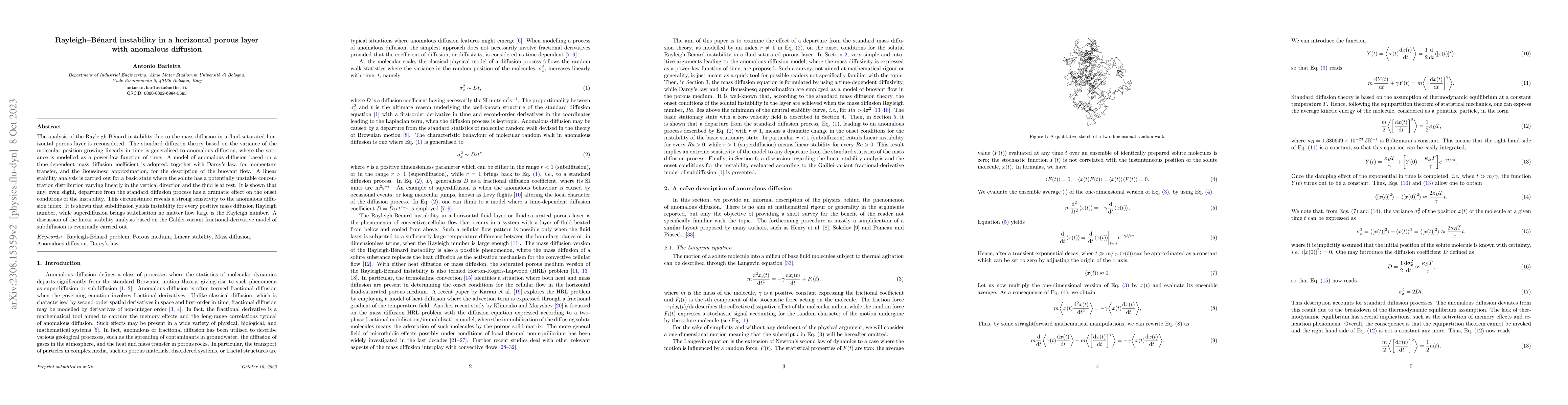 The paper presents a generalized linear stability analysis for Rayleigh-Bénard instability in porous layers, incorporating anomalous diffusion through a time-dependent mass diffusion coefficient and Darcy's law for fluid flow.