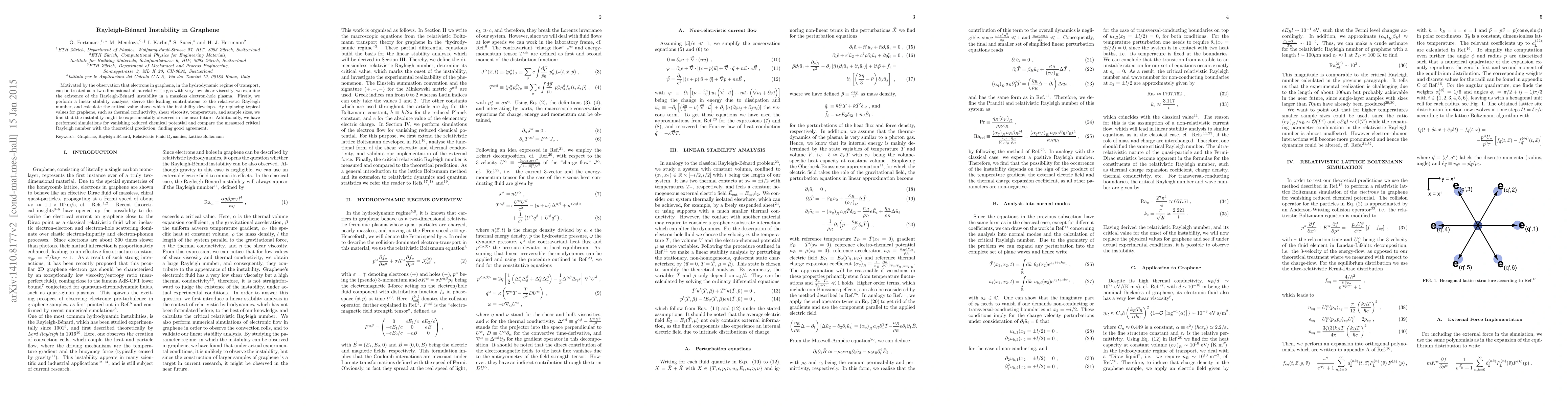This paper investigates the Rayleigh-Bénard instability in graphene's electron-hole plasma, deriving the critical value for instability onset through linear stability analysis. The study suggests that the instability could be experimentally observable soon, supported by simulations showing good agreement with theoretical predictions.