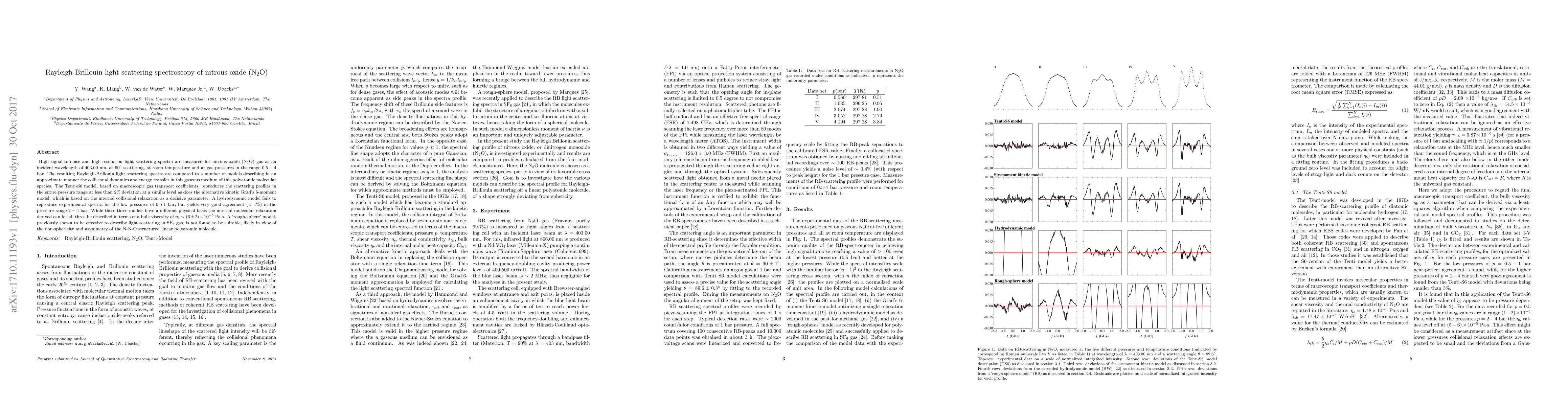 Researchers measured Rayleigh-Brillouin light scattering spectra for nitrous oxide gas at various pressures, comparing the results to three models that describe collisional dynamics and energy transfer. The Tenti-S6 model and Grad's 6-moment model reproduced the spectra with high accuracy, while a hydrodynamic model worked well at higher pressures but failed at lower ones.