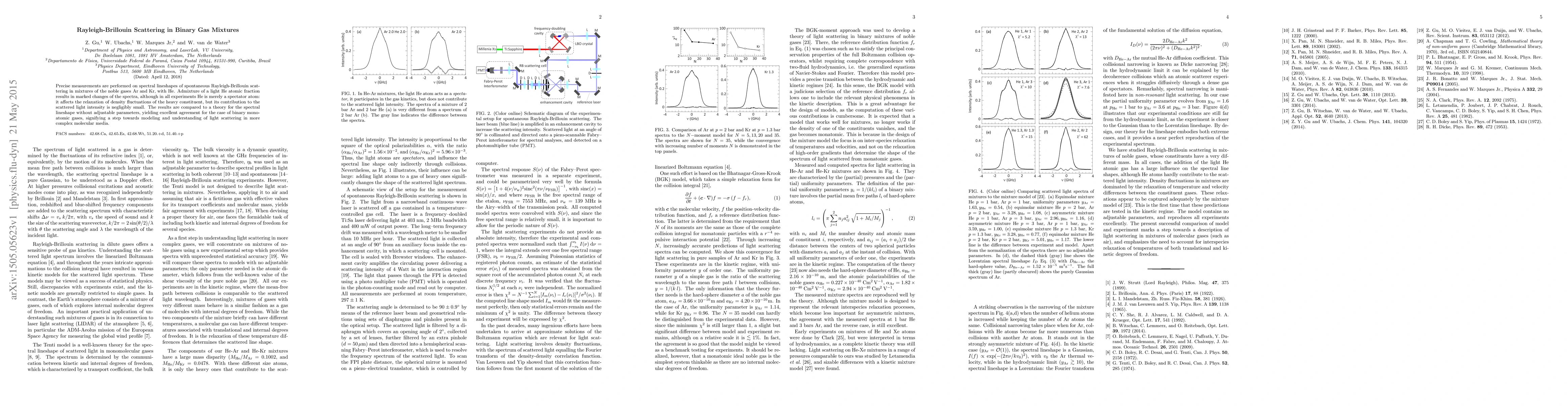 This study measures spectral lineshapes of Rayleigh-Brillouin scattering in binary gas mixtures of Ar, Kr, and He, finding that He influences density fluctuations without significantly affecting scattered light. Theoretical models show excellent agreement with the experimental results, advancing the understanding of light scattering in complex mixtures.
