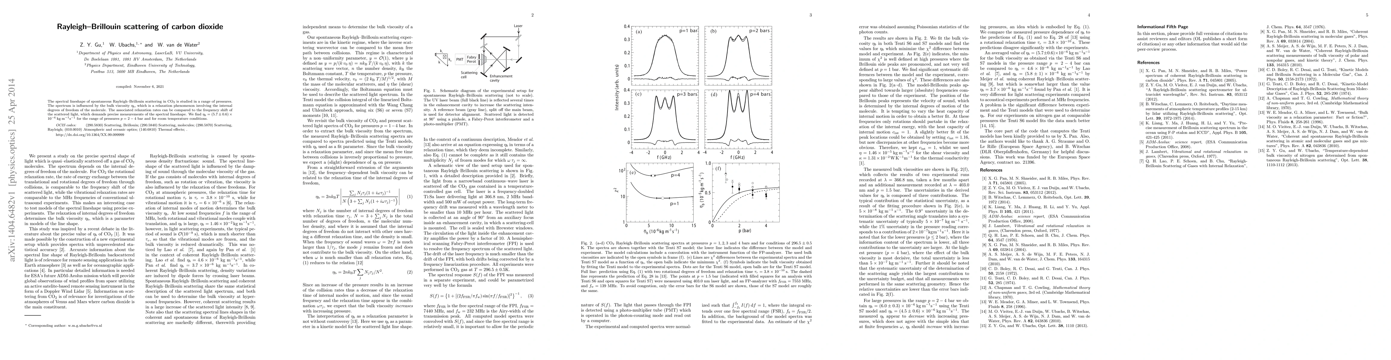 Researchers studied Rayleigh-Brillouin scattering in CO2 at various pressures, finding a bulk viscosity of around 5.7 x 10^-6 kg/(ms) for the range of p= 2-4 bar and room temperature conditions.