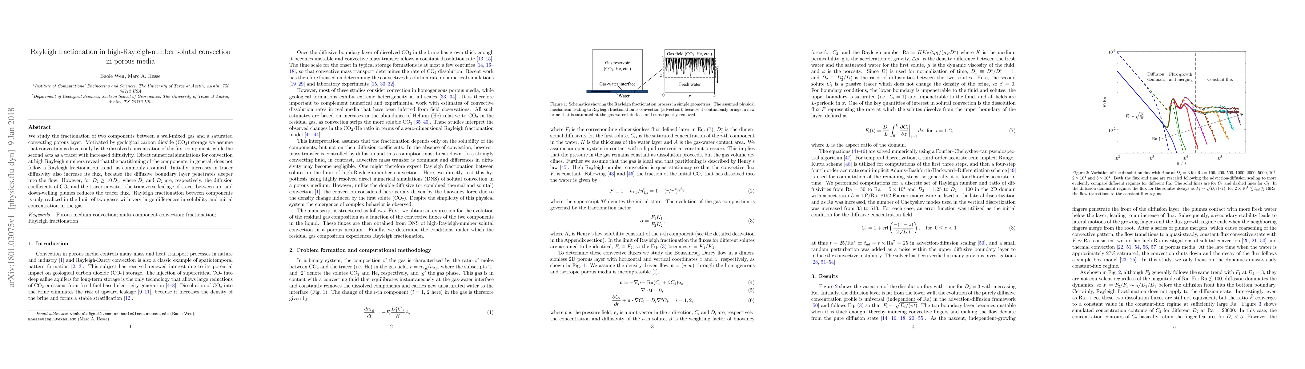We study the fractionation of two components between a well-mixed gas and a saturated convecting porous layer. Motivated by geological carbon dioxide (CO$_2$) storage we assume that convection is driven only by the dissolved concentration of the first component, while the second acts as a tracer with increased diffusivity. Direct numerical simulations for convection at high Rayleigh numbers reveal that the partitioning of the components, in general, does not follow a Rayleigh fractionation trend, as commonly assumed. Initially, increases in tracer diffusivity also increase its flux, because the diffusive boundary layer penetrates deeper into the flow. However, for $D_2\geq 10\, D_1$, where $D_1$ and $D_2$ are, respectively, the diffusion coefficients of CO$_2$ and the tracer in water, the transverse leakage of tracer between up- and down-welling plumes reduces the tracer flux. Rayleigh fractionation between components is only realized in the limit of two gases with very large differences in solubility and initial concentration in the gas.