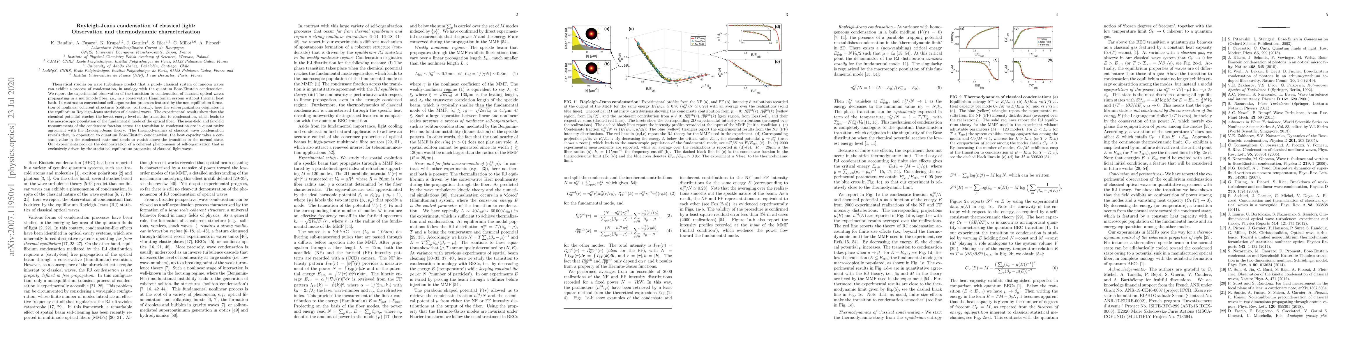 This paper reports the experimental observation of Rayleigh-Jeans condensation in classical optical waves within a multimode fiber, analogous to quantum Bose-Einstein condensation but driven by equilibrium statistical properties. The study reveals a constant heat capacity in the condensed state, contrasting with the behavior in quantum systems.