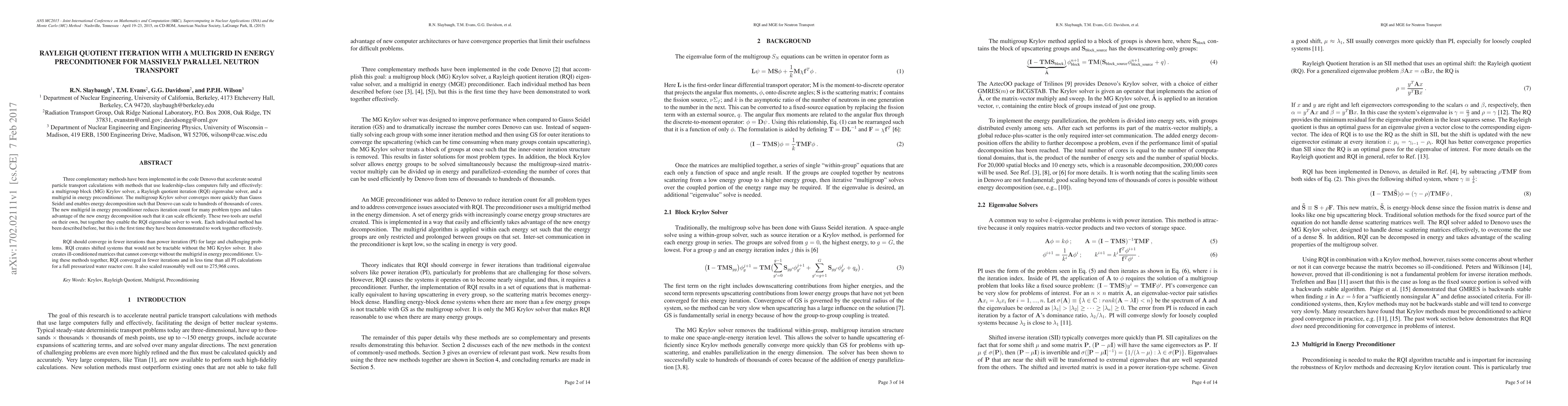 This paper presents a combination of three methods—a multigroup Krylov solver, Rayleigh quotient iteration, and a multigrid in energy preconditioner—to accelerate neutron transport calculations on massively parallel systems. Together, these methods enable efficient scaling and faster convergence for large, complex problems, as demonstrated in a pressurized water reactor core simulation.