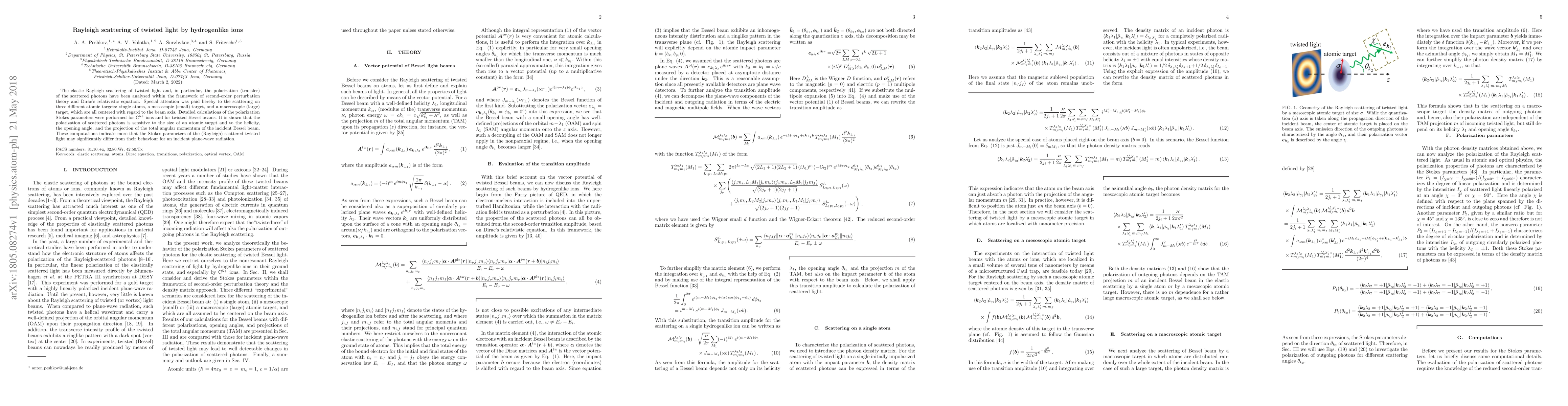 The elastic Rayleigh scattering of twisted light and, in particular, the polarization (transfer) of the scattered photons have been analyzed within the framework of second-order perturbation theory and Dirac's relativistic equation. Special attention was paid hereby to the scattering on three different atomic targets: single atoms, a mesoscopic (small) target, and a macroscopic (large) target, which are all centered with regard to the beam axis. Detailed calculations of the polarization Stokes parameters were performed for C^{5+} ions and for twisted Bessel beams. It is shown that the polarization of scattered photons is sensitive to the size of an atomic target and to the helicity, the opening angle, and the projection of the total angular momentum of the incident Bessel beam. These computations indicate more that the Stokes parameters of the (Rayleigh) scattered twisted light may significantly differ from their behaviour for an incident plane-wave radiation.