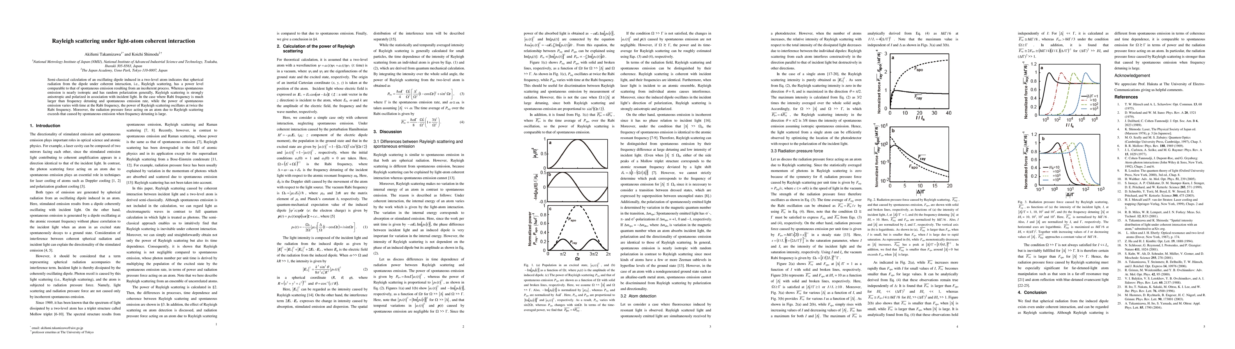Semi-classical calculation of an oscillating dipole induced in a two-level atom indicates that spherical radiation from the dipole under coherent interaction, i.e., Rayleigh scattering, has a power level comparable to that of spontaneous emission resulting from an incoherent process. Whereas spontaneous emission is nearly isotropic and has random polarization generally, Rayleigh scattering is strongly anisotropic and polarized in association with incident light. In the case where Rabi frequency is much larger than frequency detuning and spontaneous emission rate, while the power of spontaneous emission varies with time at the Rabi frequency, the power of Rayleigh scattering oscillates at twice the Rabi frequency. Moreover, the radiation pressure force acting on an atom due to Rayleigh scattering exceeds that caused by spontaneous emission when frequency detuning is large.