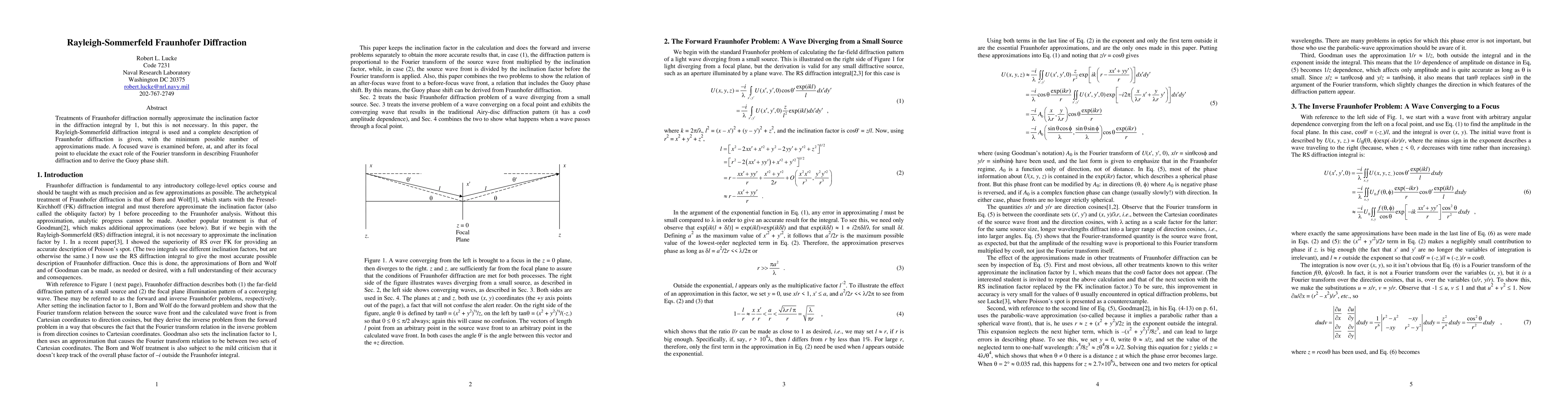 Treatments of Fraunhofer diffraction normally approximate the inclination factor in the diffraction integral by 1, but this is not necessary. In this paper, the Rayleigh-Sommerfeld diffraction integral is used and a complete description of Fraunhofer diffraction is given, with the minimum possible number of approximations made. A focused wave is examined before, at, and after its focal point to elucidate the exact role of the Fourier transform in describing Fraunhofer diffraction and to derive the Guoy phase shift.