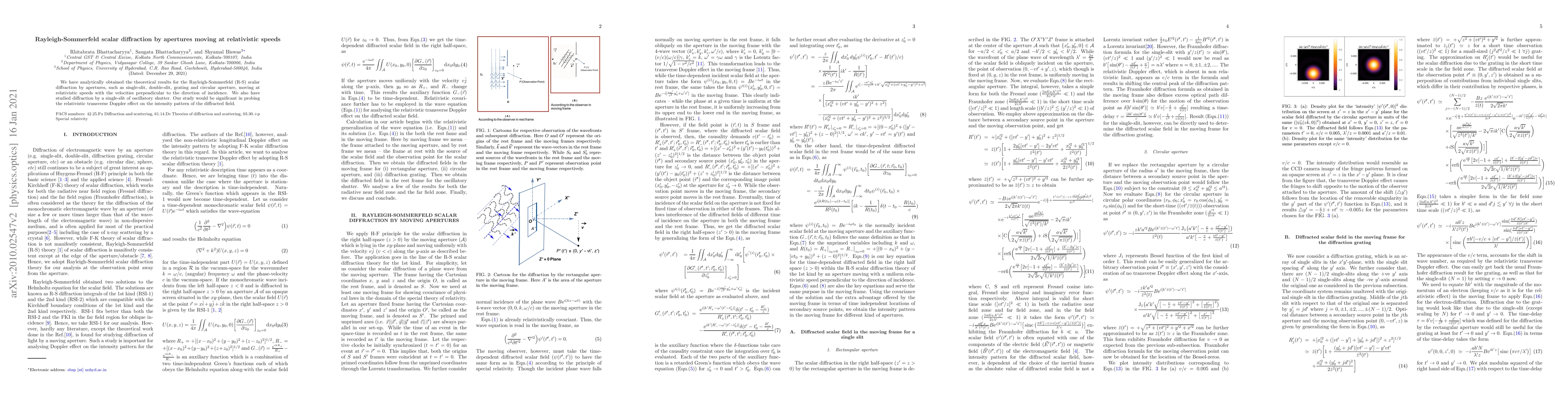 This paper analytically explores Rayleigh-Sommerfeld scalar diffraction for various apertures moving at relativistic speeds, focusing on the relativistic transverse Doppler effect on diffracted field intensity patterns. The study includes single-slit, double-slit, grating, and circular apertures, as well as oscillatory shutter configurations.