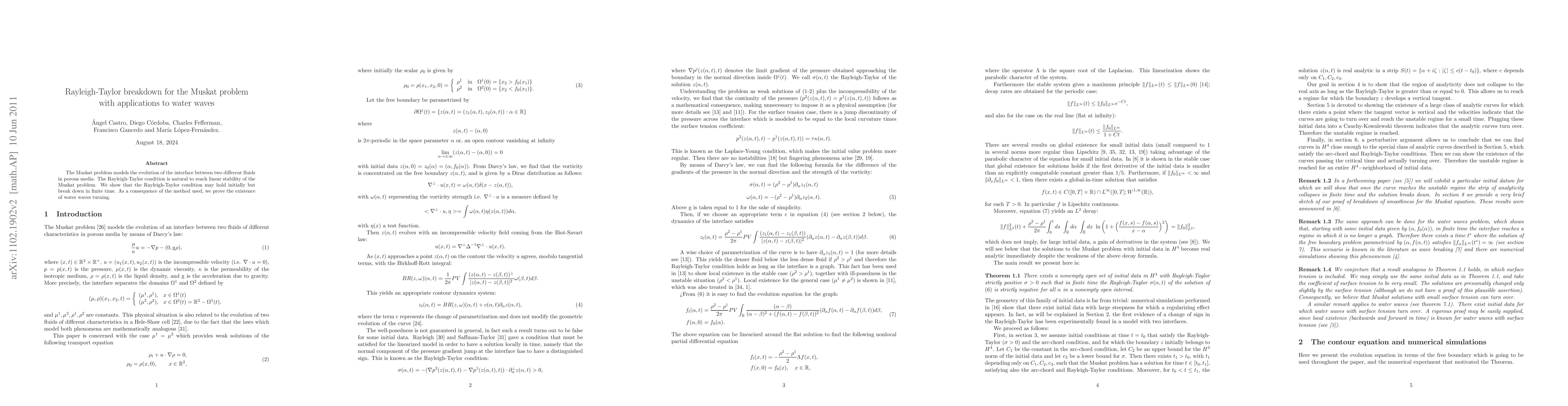 The Muskat problem models the evolution of the interface given by two different fluids in porous media. The Rayleigh-Taylor condition is natural to reach the linear stability of the Muskat problem. We show that the Rayleigh-Taylor condition may hold initially but break down in finite time. As a consequence of the method used, we prove the existence of water waves turning.