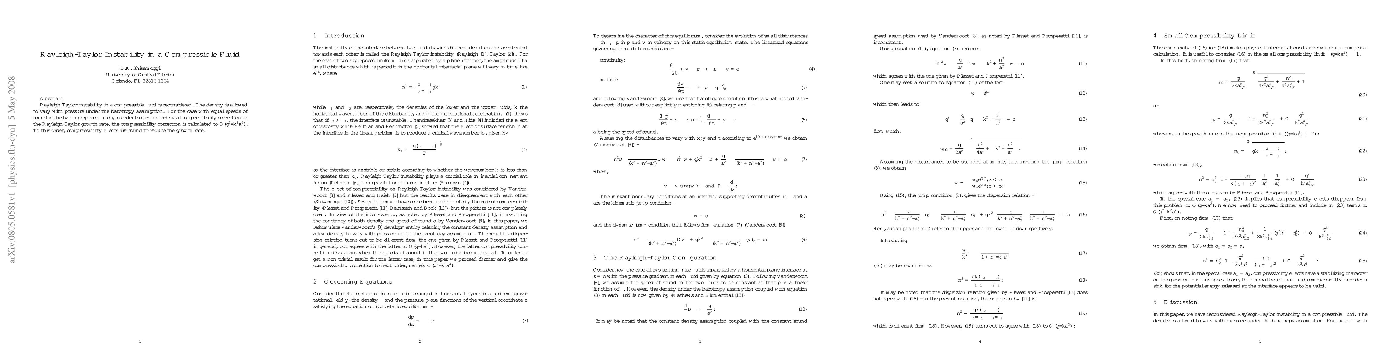 This study examines Rayleigh-Taylor instability in compressible fluids, allowing density to vary with pressure under the barotropy assumption. It finds that compressibility effects, calculated to $O(g^2/k^2a^4)$, reduce the growth rate of the instability when the speeds of sound in the superposed fluids are equal.