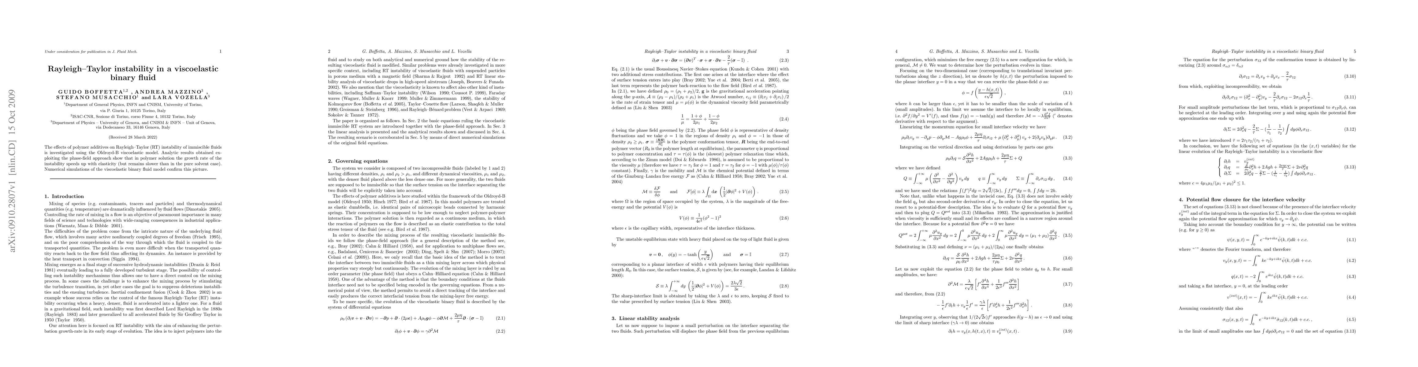 The paper presents a detailed analytical and numerical study of RT instability in viscoelastic binary fluids, incorporating the Oldroyd-B model and phase-field approach to understand the role of polymer additives.
